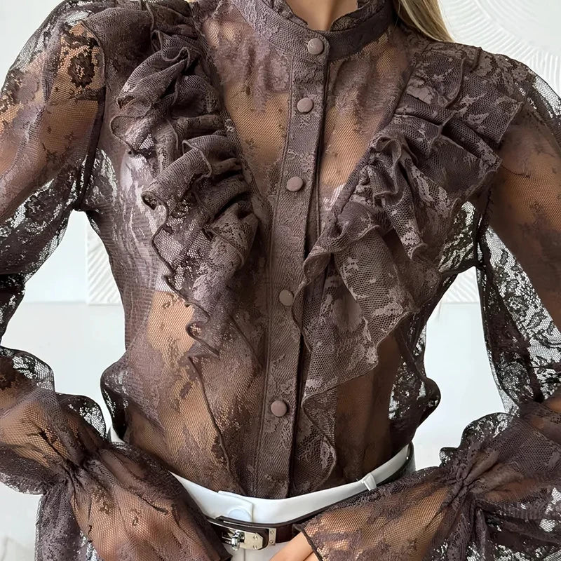 - Design: Sheer lace blouse with refined ruffle panels