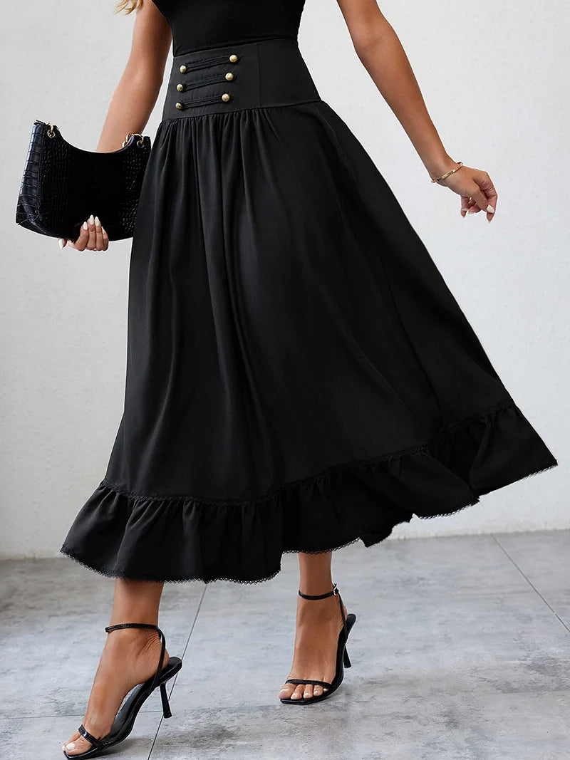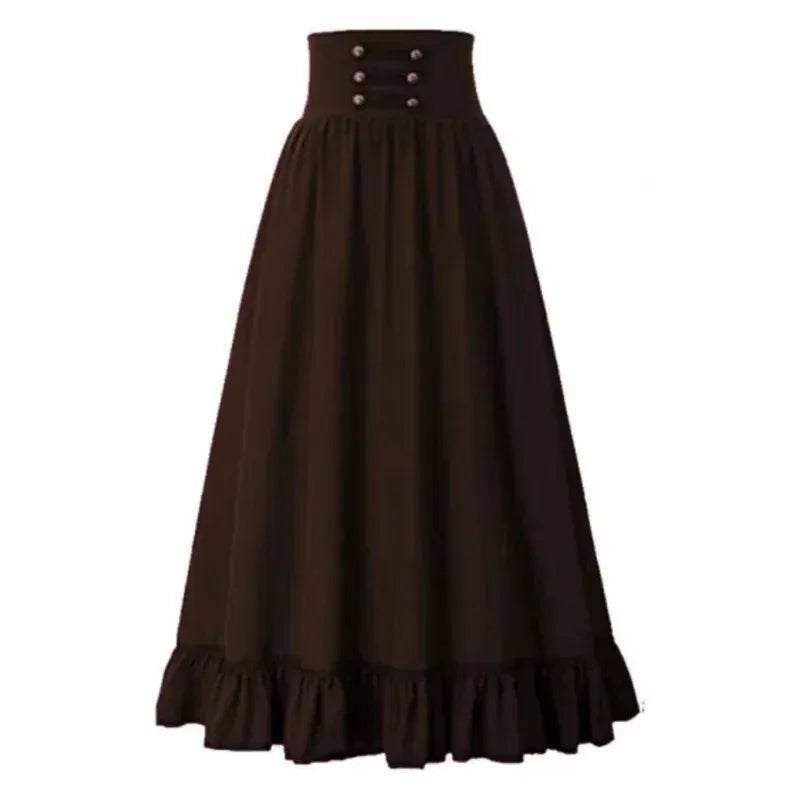 • Elevate your style with this elegant Retro Maxi Steampunk Skirt, featuring a high waist and charming ruffled hem for a perfect blend of vintage and modern.