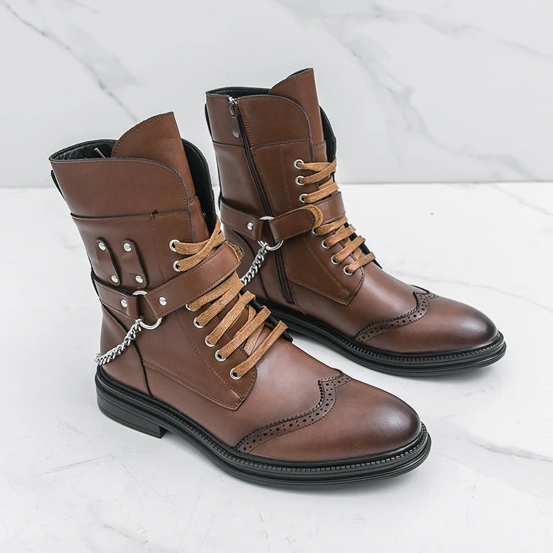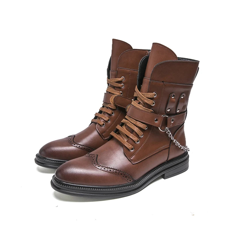 These retro steampunk chain boots for men are built for those who want fashion with function. The high-top construction offers reliable ankle support, while the PU leather upper ensures durability and easy maintenance. Accented with a metal chain detail, these boots deliver a strong visual impact without compromising comfort. Ideal for urban wear, riding, or daily activities, they blend rugged design with modern versatility.