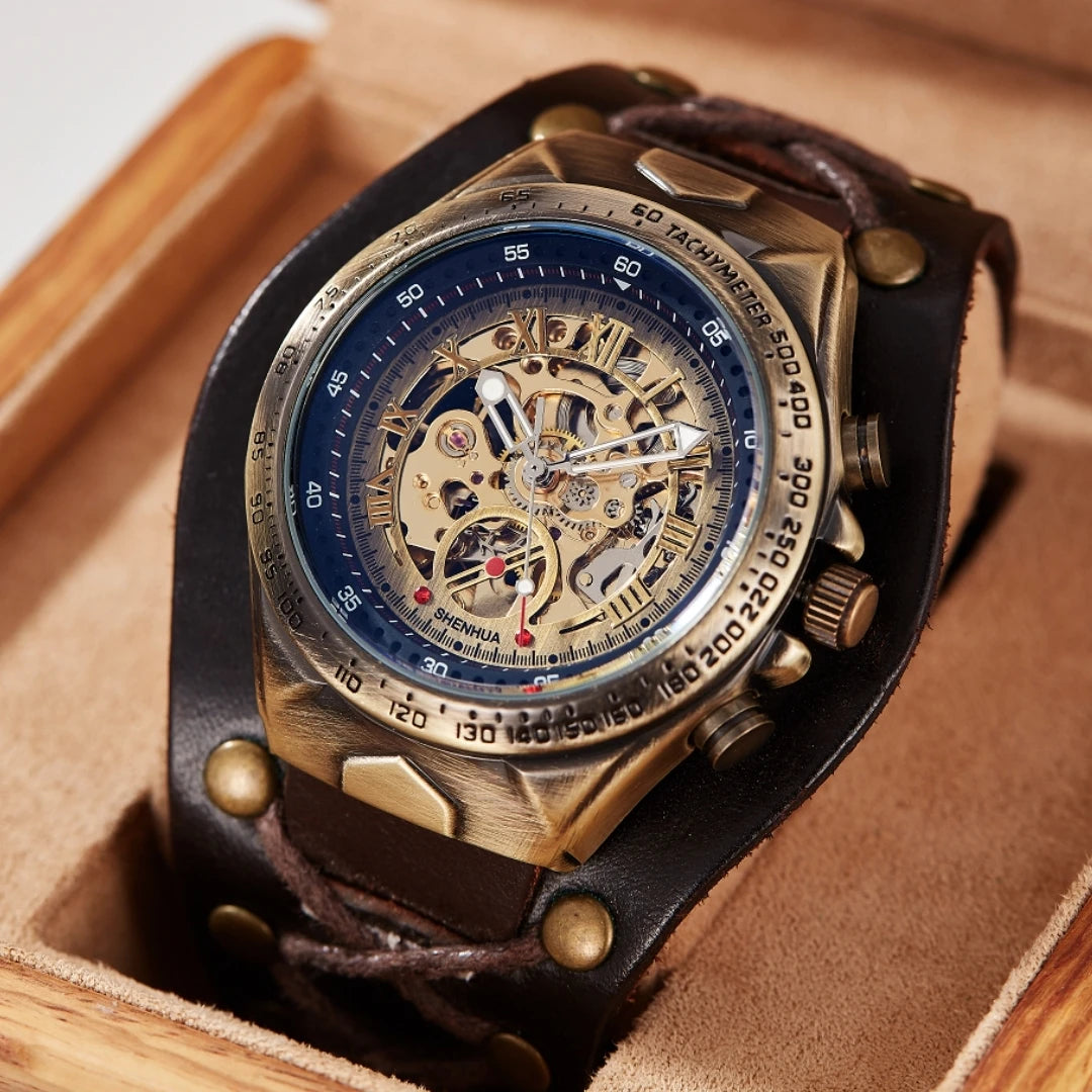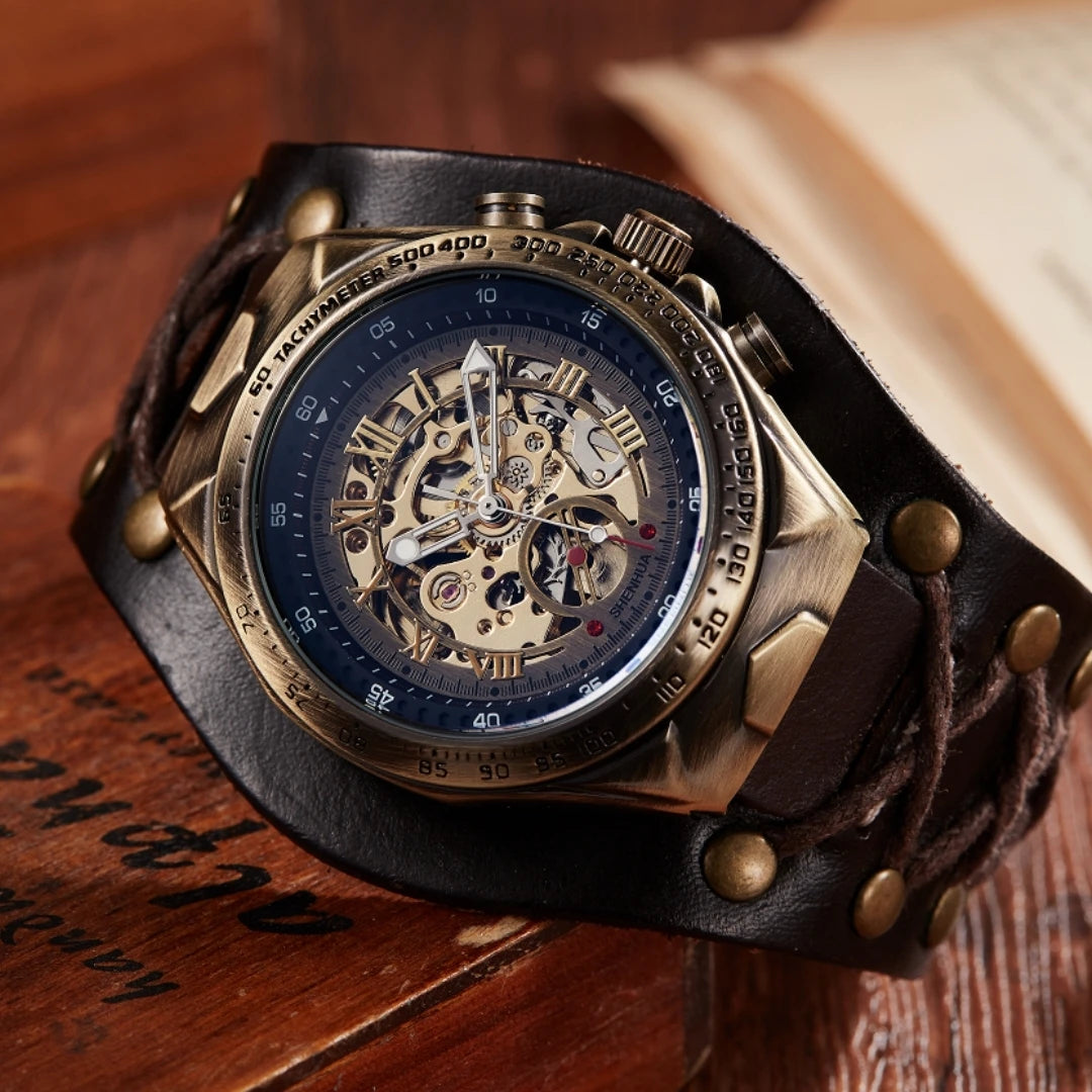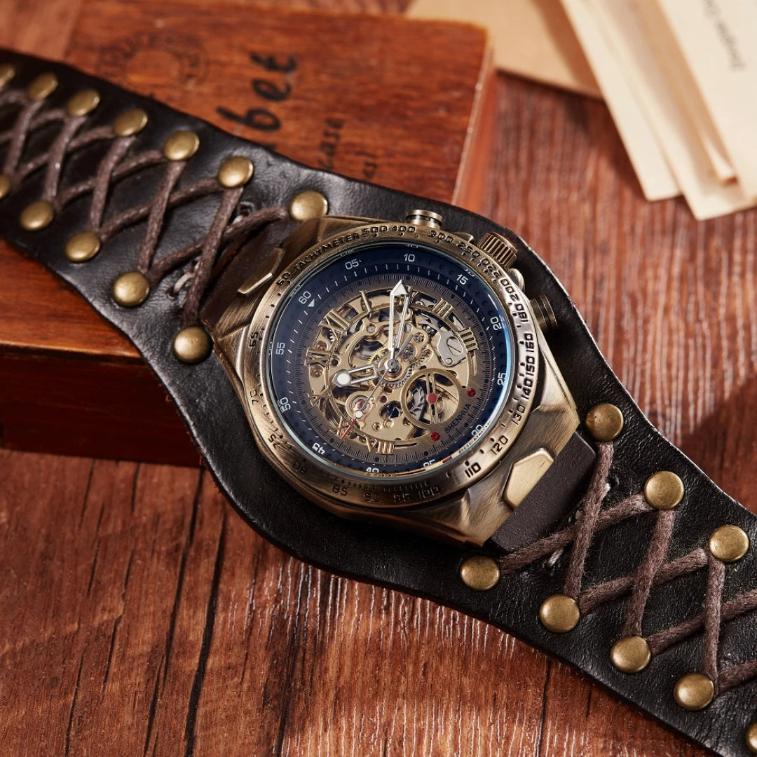 This retro steampunk wristwatch features a bold skeleton dial that exposes its internal mechanical movement. The bronze antique finish enhances the vintage aesthetic, while the wide leather strap with lace-up details adds character and presence. The visible gears create a dynamic visual effect, making the watch stand out on the wrist. Its design fits both casual and statement looks, offering a strong accessory that complements industrial and vintage-inspired styles effortlessly.