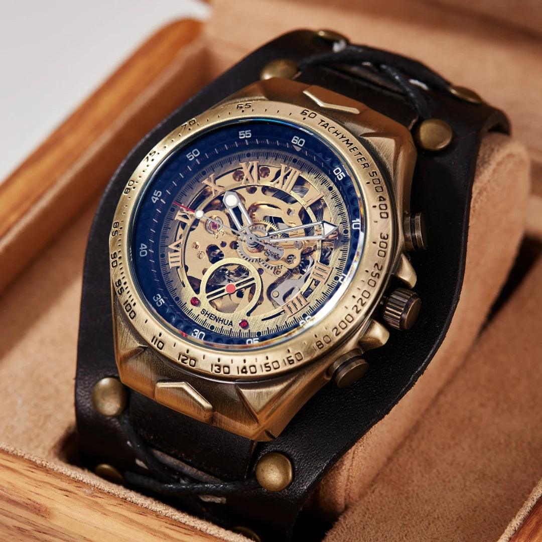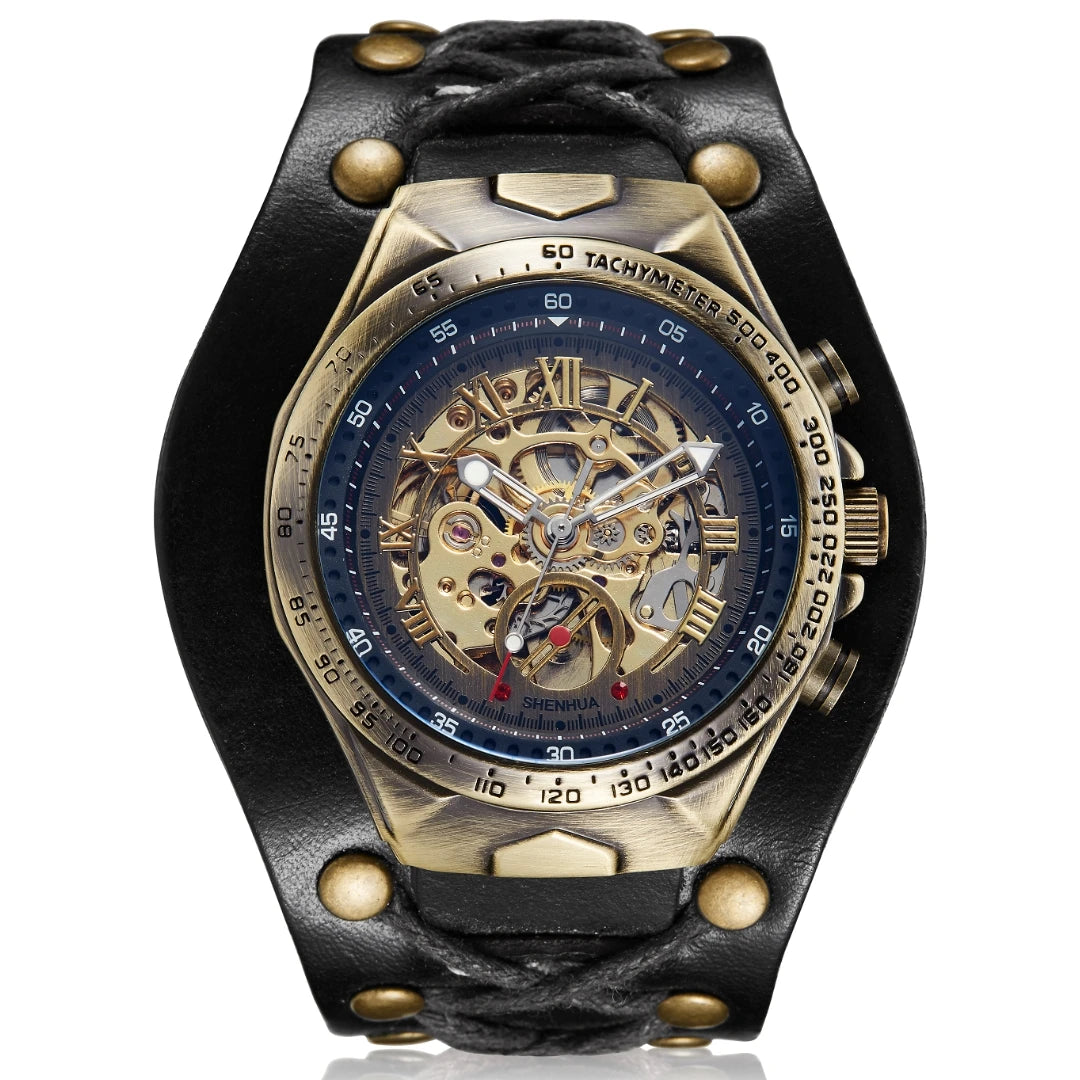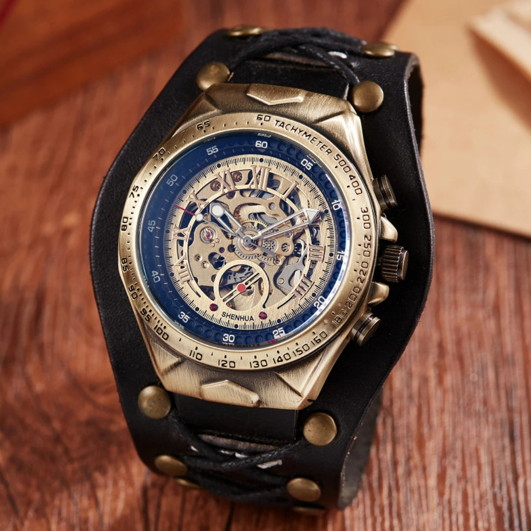 This retro steampunk wristwatch features a bold skeleton dial that exposes its internal mechanical movement. The bronze antique finish enhances the vintage aesthetic, while the wide leather strap with lace-up details adds character and presence. The visible gears create a dynamic visual effect, making the watch stand out on the wrist. Its design fits both casual and statement looks, offering a strong accessory that complements industrial and vintage-inspired styles effortlessly.