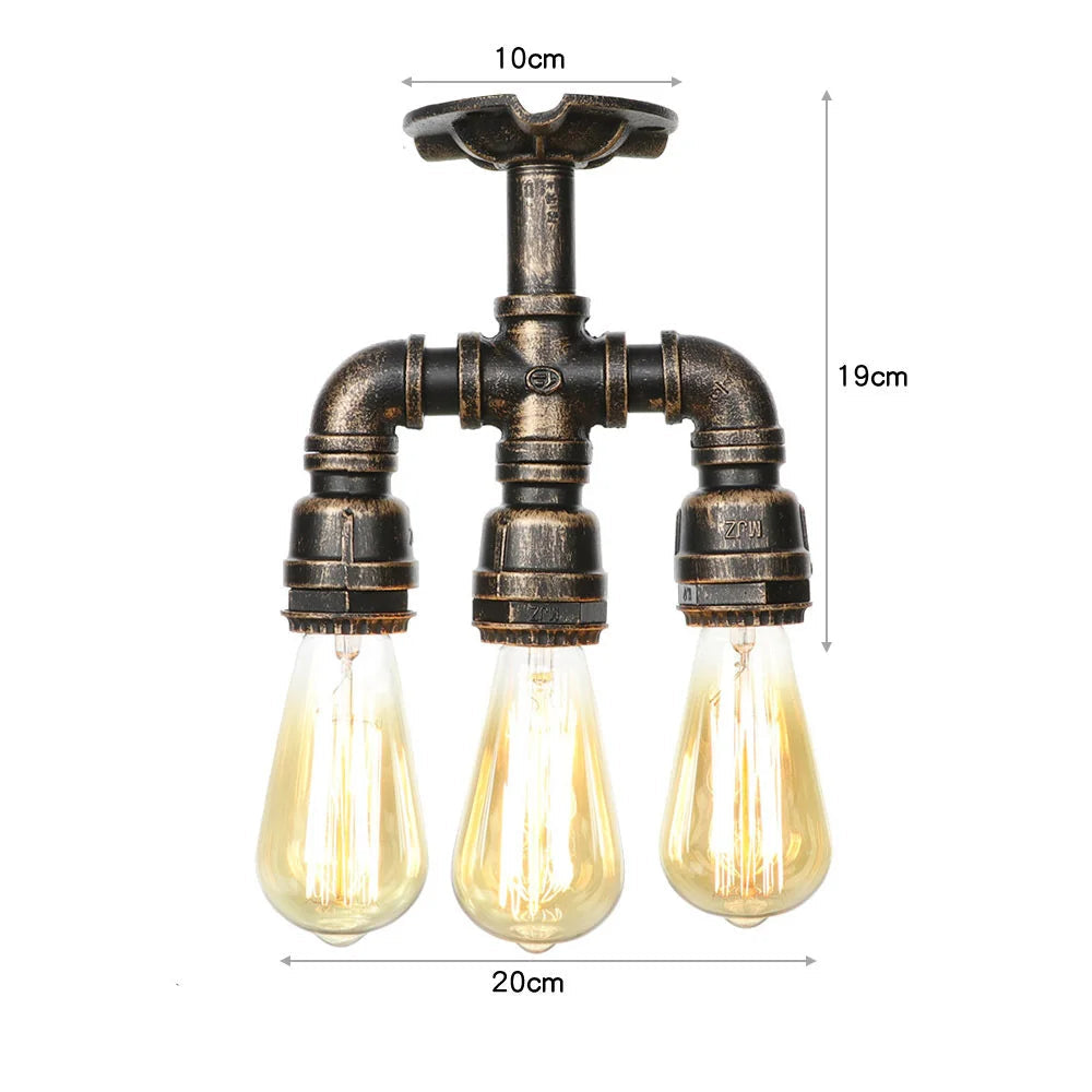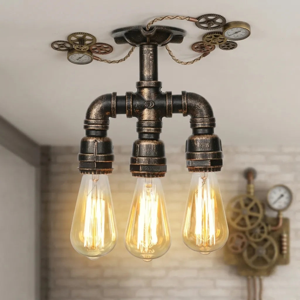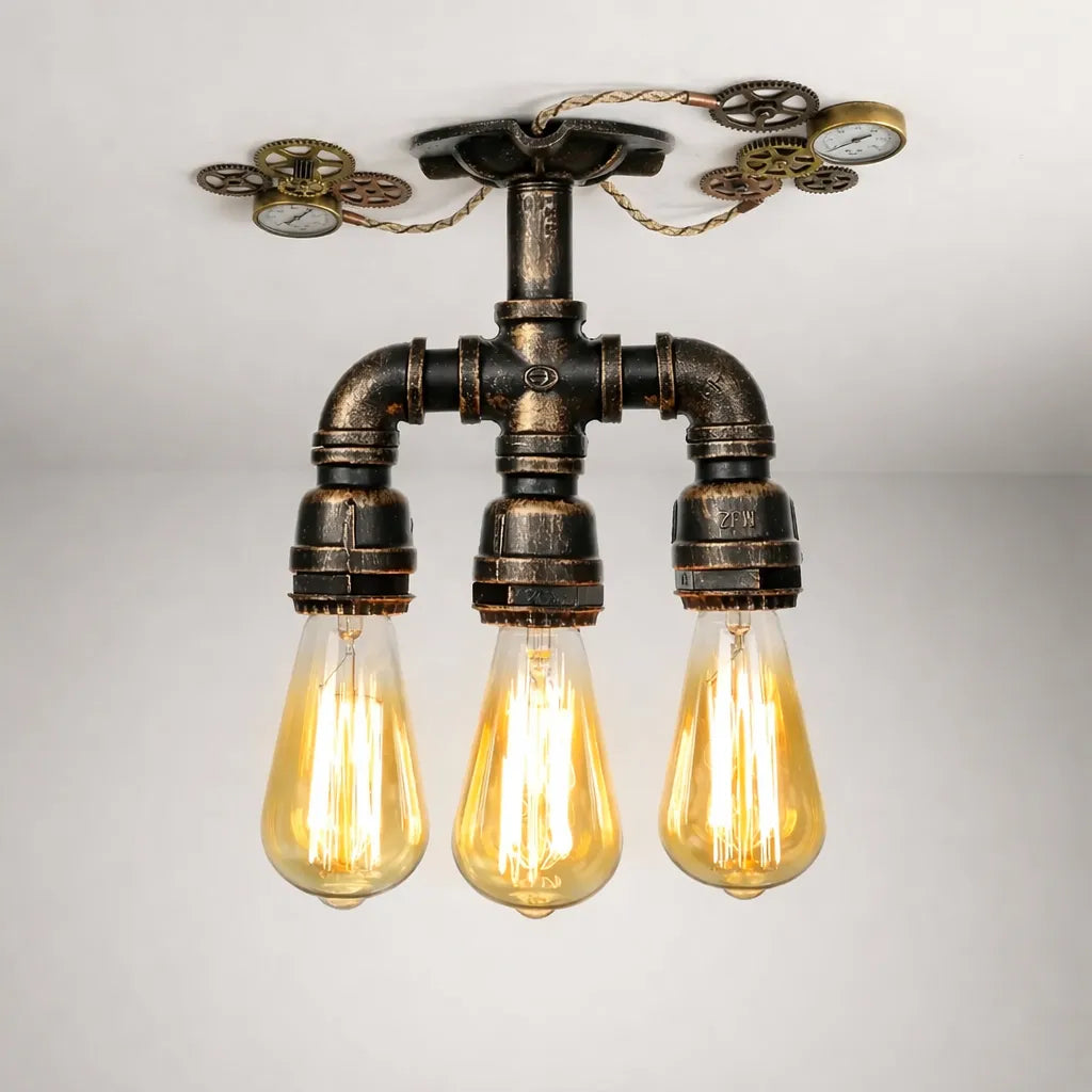 This retro steampunk three-headed lamp embodies the industrial spirit with its design inspired by metal pipes. Every detail, from the aged copper to the hanging bulbs, reflects an era where functionality meets aesthetics. Perfect for a loft or workshop-style décor, this lamp provides warm lighting while adding a unique character to your space. Its vintage look instantly transforms the atmosphere of any room.