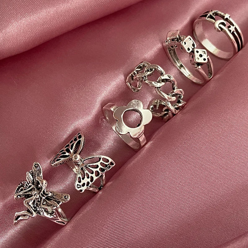 Designed for those who love expressive accessories, this six-piece steampunk ring set blends fantasy, vintage charm, and edgy elegance. Featuring sculpted butterflies, a delicate fairy, chunky chain links, playful dice, celestial symbols, and a minimalist flower, each ring tells its own story. The antique silver finish enhances every intricate detail. Wear them stacked for dramatic impact or separately for subtle character. This versatile set adapts effortlessly to your mood and outfit.