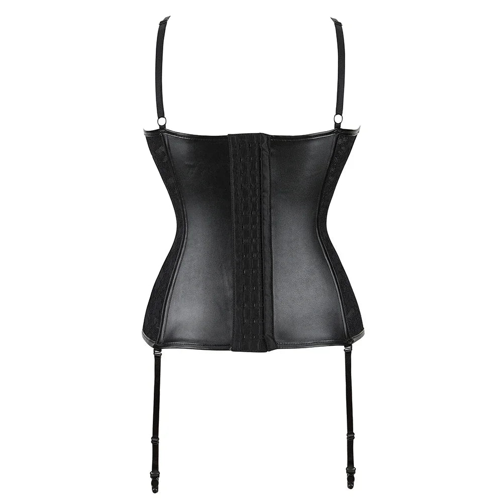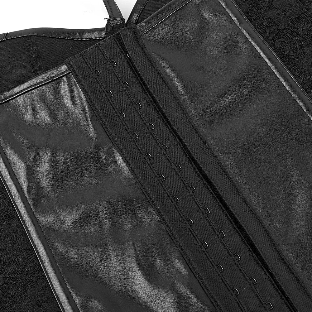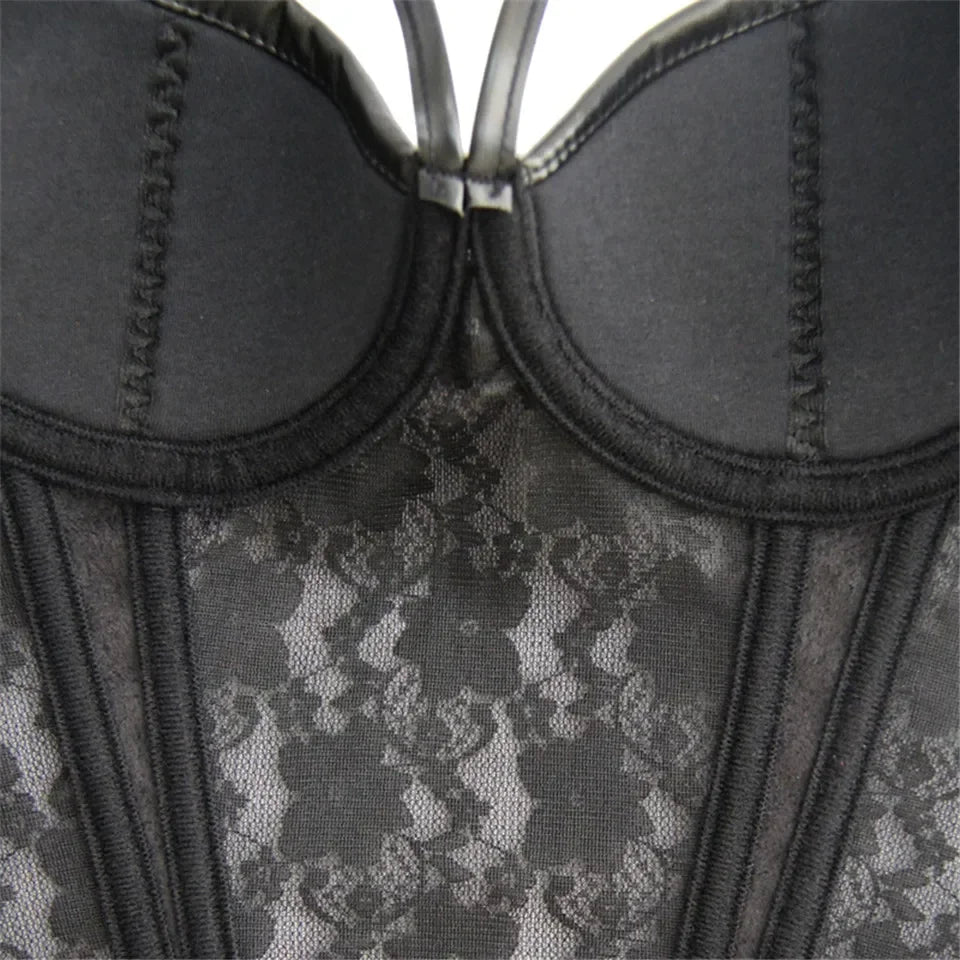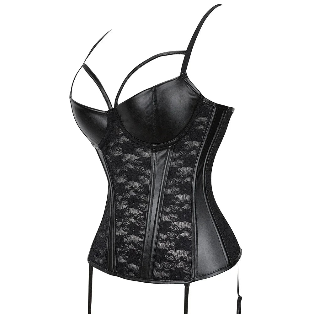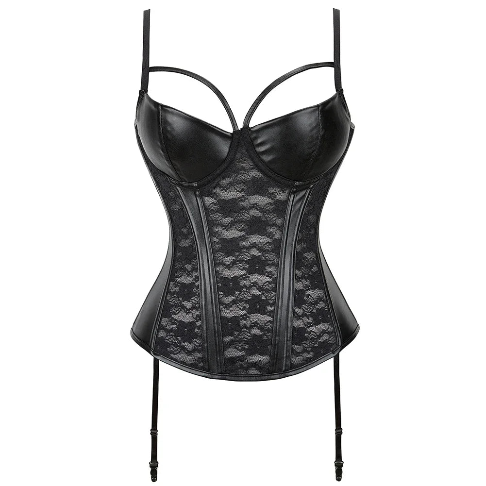 This sexy steampunk lace corset is designed to highlight the waist while enhancing the bust with structured support. The combination of floral lace and smooth faux leather creates a refined yet daring look. Its overbust cut offers confident coverage, while the shaped panels contour the body naturally. Ideal for parties or styled as a statement lingerie piece, this corset delivers a balance of elegance, strength, and feminine appeal in one bold design.
