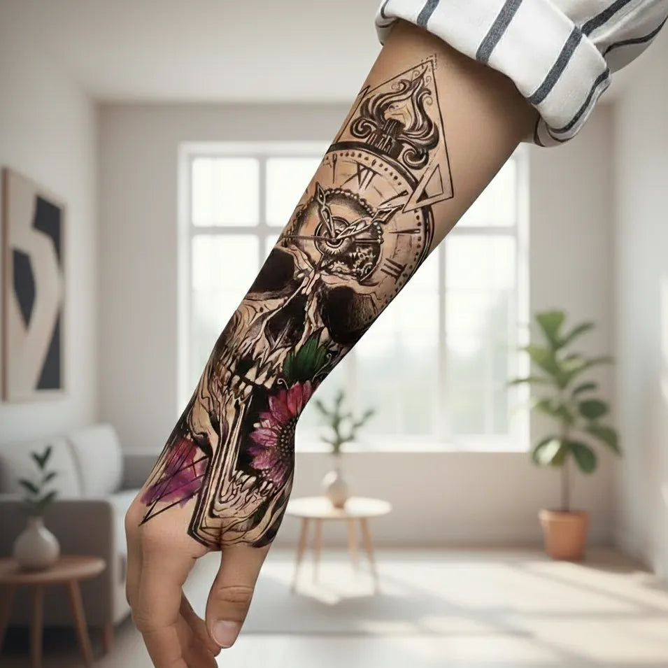 The temporary Steampunk Clock Tattoo symbolizes the passing of time and the fragility of life.