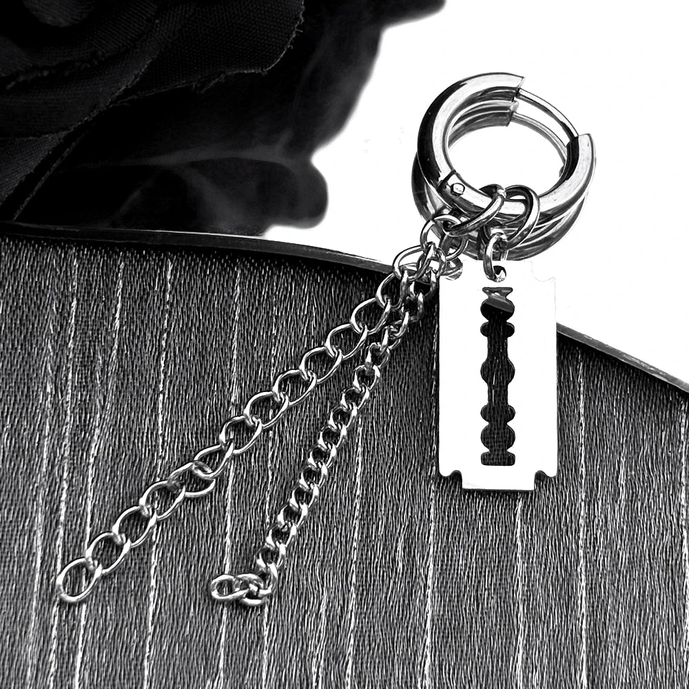 The contrast between the clean blade shape and the softness of the chains creates a controlled visual tension. Each element is designed to deliver lightness and impact without decorative excess. The upper hoop ensures a smooth transition between fastening and pendant. These earrings embody a confident accessory, perfect for completing an alternative, urban, or modern steampunk outfit with assurance.