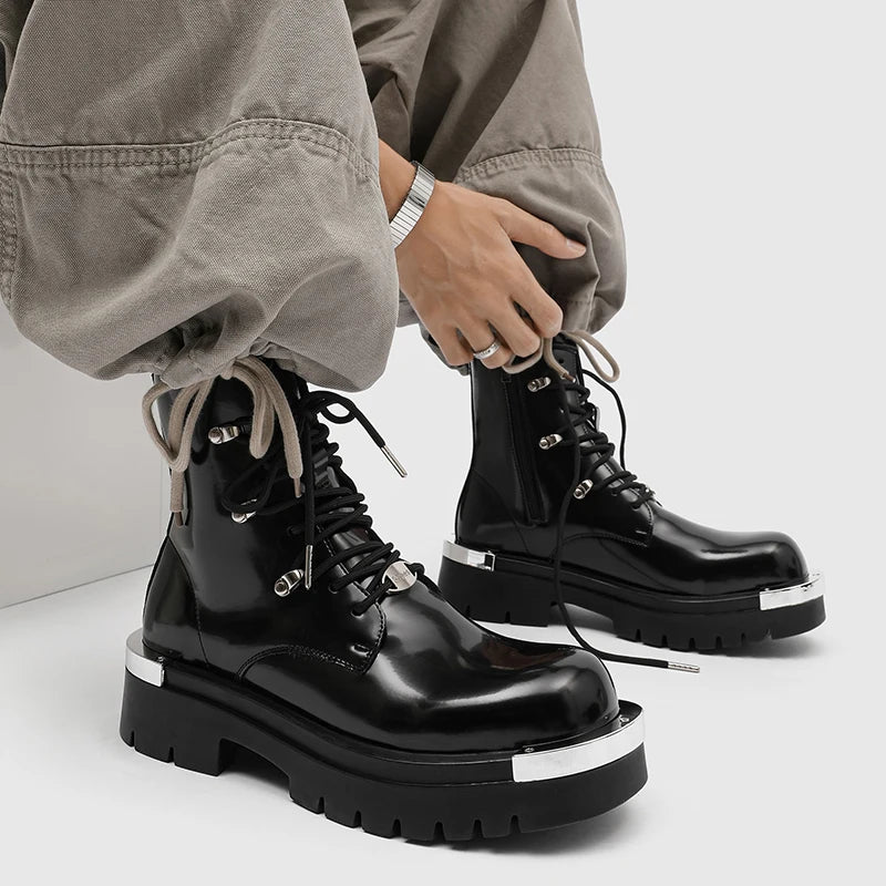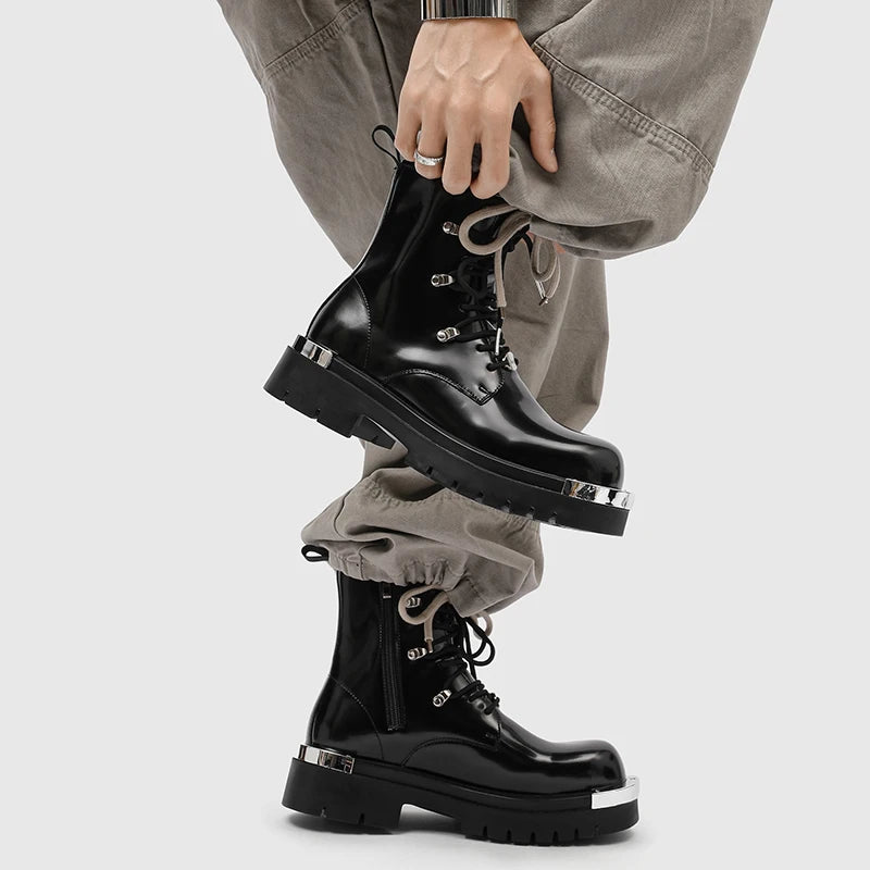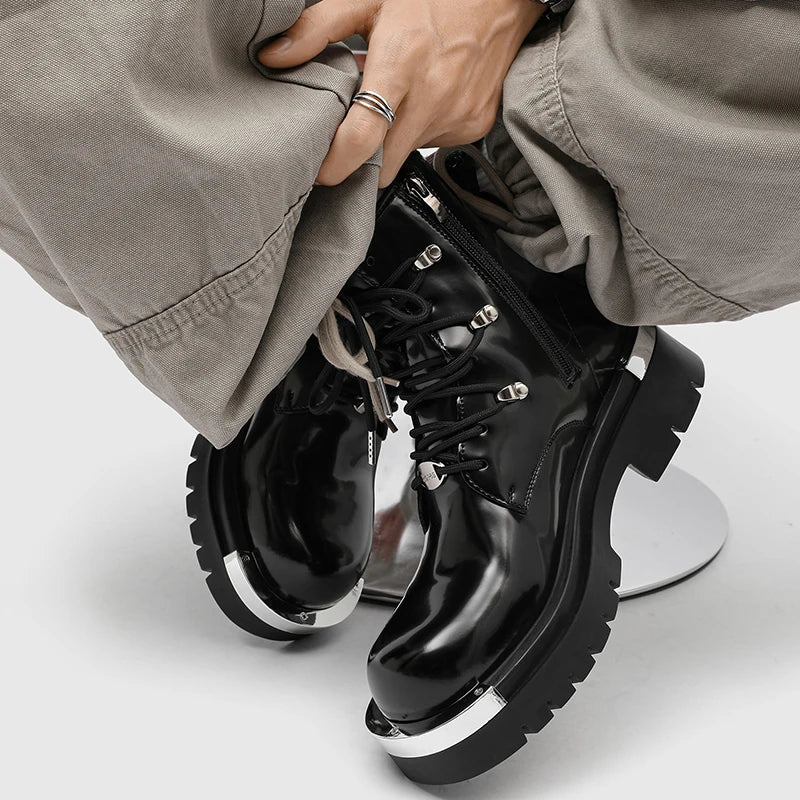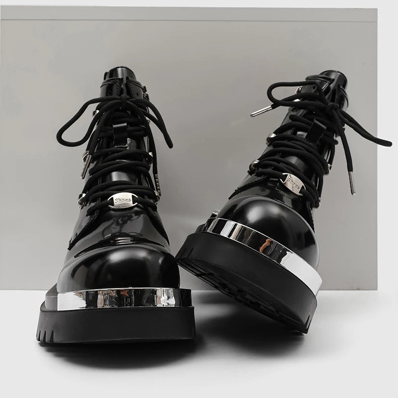 These steampunk boots feature a striking glossy black finish combined with bold silver metal toe plates. Inspired by European and American biker aesthetics, their design blends gothic attitude with industrial details. The thick platform sole enhances height while reinforcing a rugged silhouette. Every element is crafted to project confidence, making these boots ideal for men who want footwear that becomes the centerpiece of their outfit. Perfect for alternative fashion lovers, they turn any look into a statement.