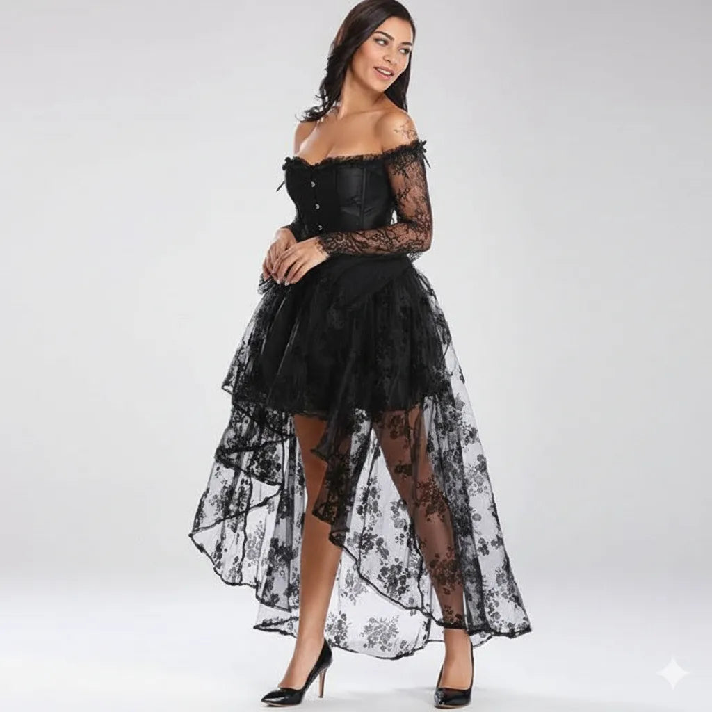 This Steampunk bridesmaid dress combines refinement and originality with its bold mix of lace, delicate corsets, and metallic details. It offers a flattering silhouette that perfectly highlights curves while adding a unique retro-futuristic touch. Ideal for a themed ceremony or creative wedding, it brings a sophisticated and captivating look that elegantly distinguishes each bridesmaid.