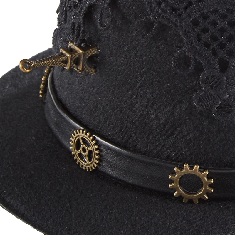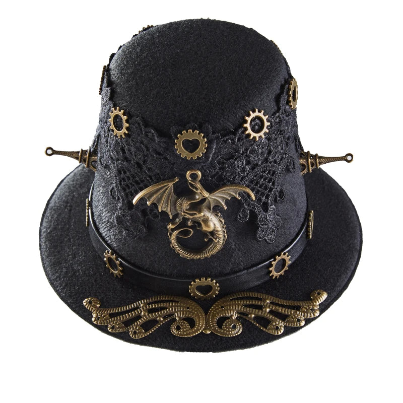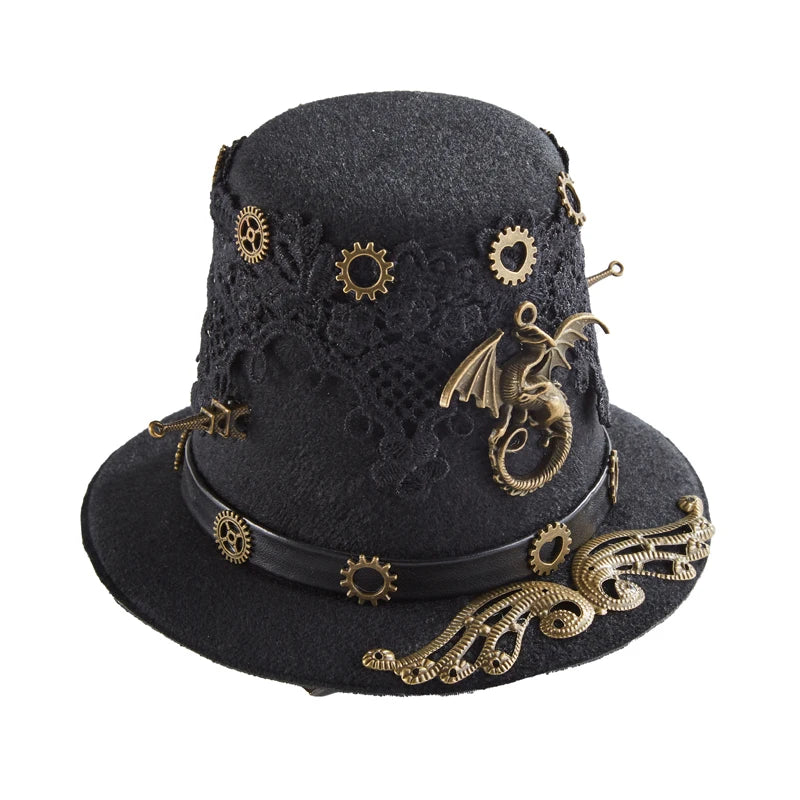 Let yourself be seduced by the rich details of this steampunk hat. The decorative gears, textured black lace, and carefully arranged metal elements create a perfect balance between mystery and sophistication. The golden dragon adds a fantastical touch that immediately catches the eye. Comfortable and visually striking, this hat is ideal for completing a steampunk, gothic, or Victorian costume and making a lasting impression.
