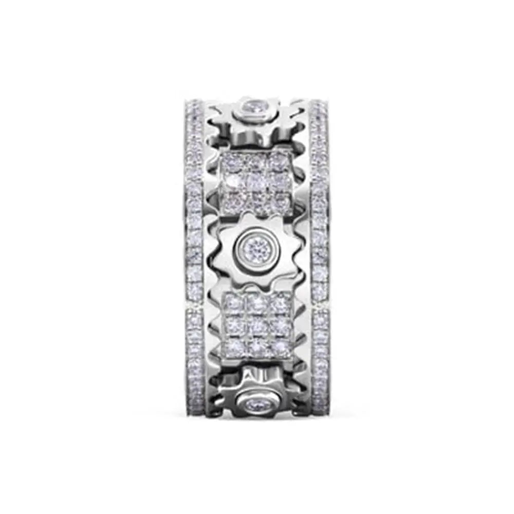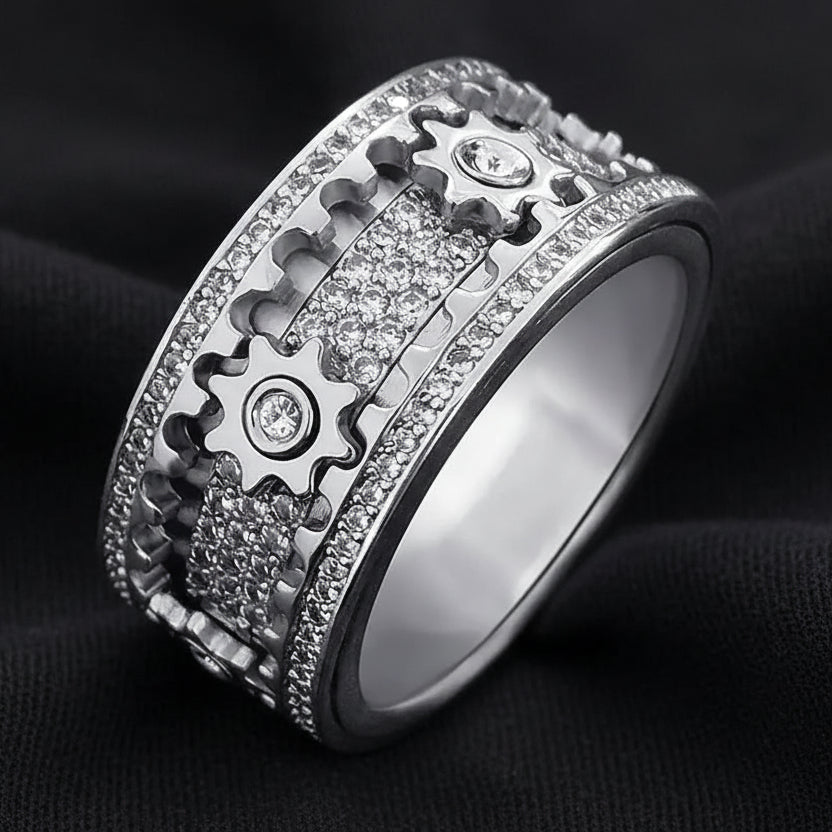 This handcrafted band ring merges refined brilliance with industrial inspiration. The symmetrical 3D gear design creates depth and visual rhythm, while the pavé-set cubic zirconia enhances its luxurious appearance. With an 8 mm face height, it delivers presence without overwhelming the hand. The rotating edge glides smoothly with a gentle twist, offering both a calming tactile experience and a distinctive mechanical aesthetic suited for formal events or everyday sophistication.