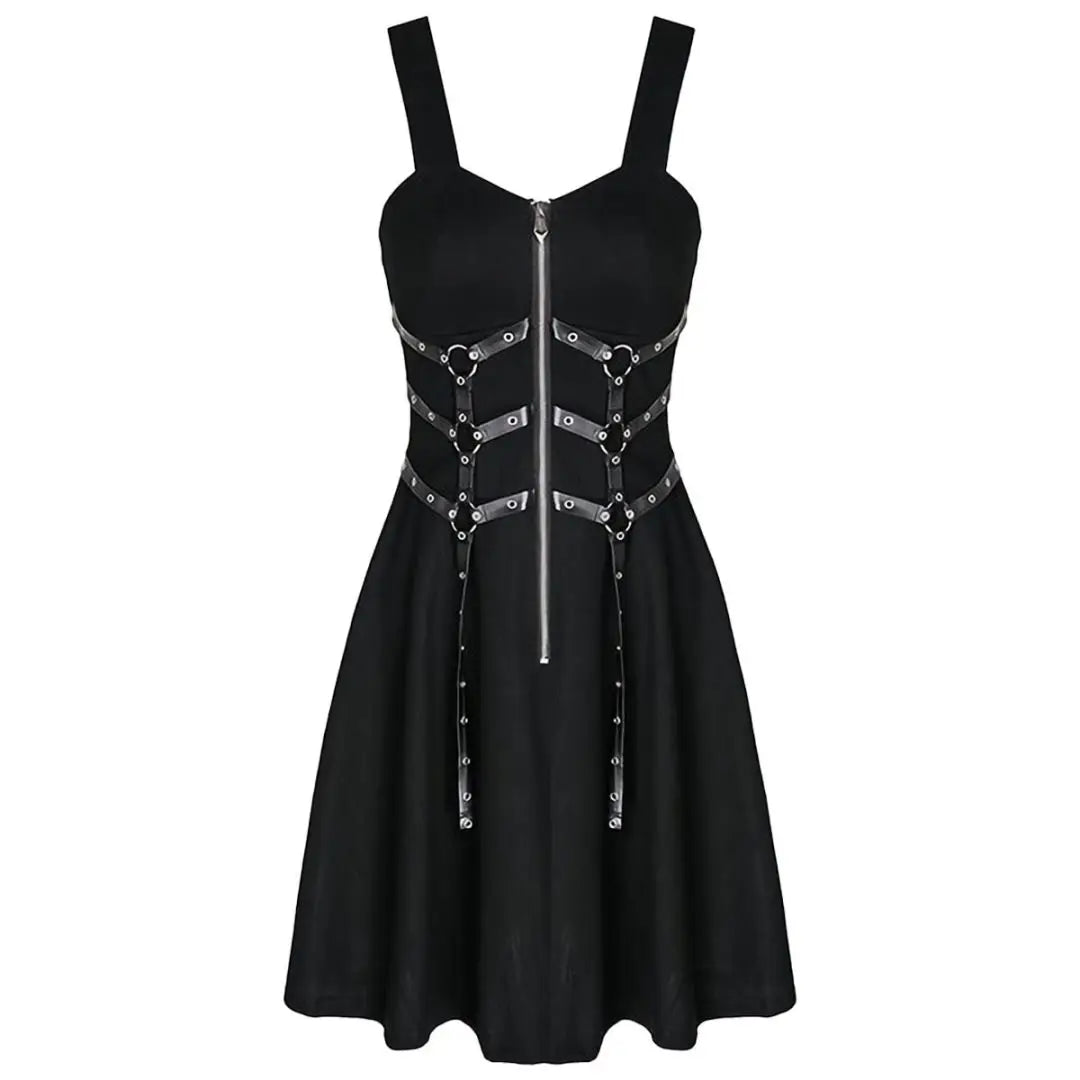This steampunk eyelet dress blends gothic elegance with bold industrial elements. The structured bodice is enhanced by metal rings and eyelet straps that create a dramatic harness effect. A central zipper adds both functionality and visual impact, reinforcing the strong silhouette. Designed to stand out, this dress delivers a commanding presence ideal for alternative fashion lovers, themed events, and dark fantasy styling.