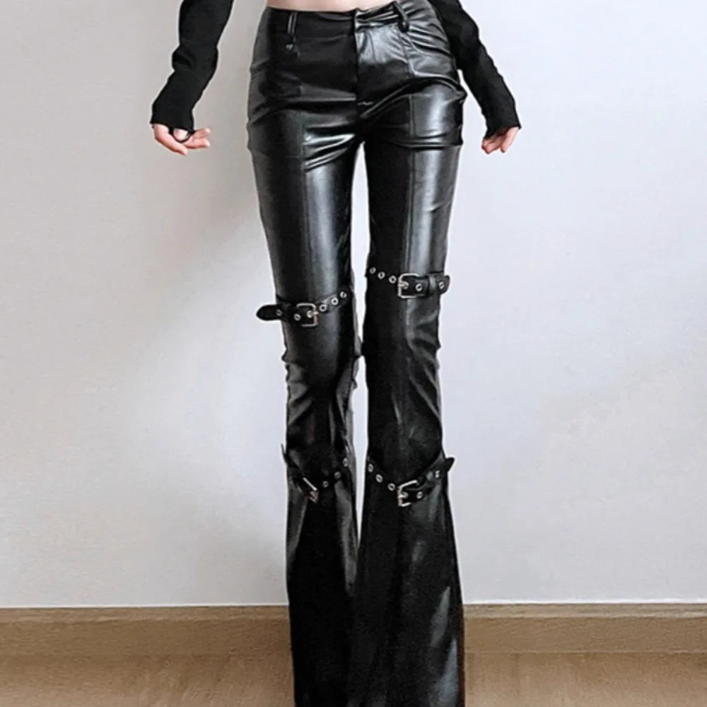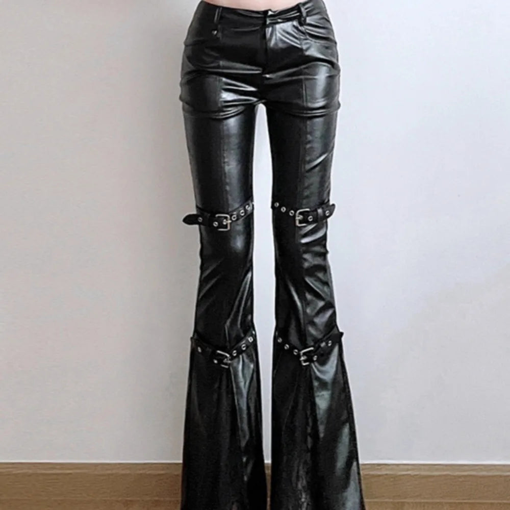 A flared faux leather steampunk pant for a bold look