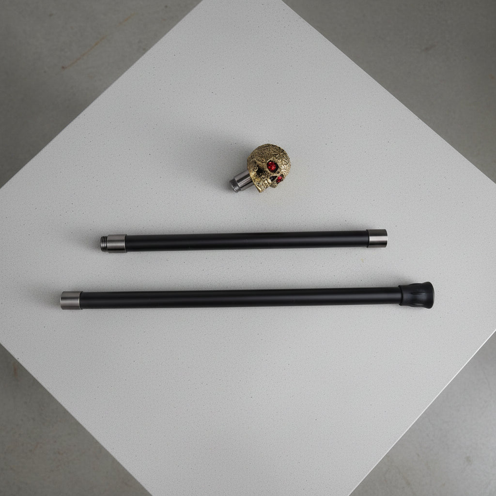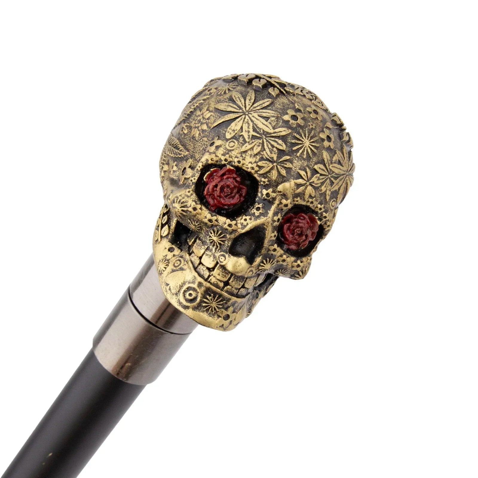 Embrace the steampunk aesthetic with this flower skull cane, featuring a resin skull head adorned with floral detailing. At 94 cm, this cane is not just a functional walking aid but a statement piece for any cosplay, themed party, or collector. The red rose eyes add an artistic touch, while the metal shaft ensures durability and comfort for everyday use.