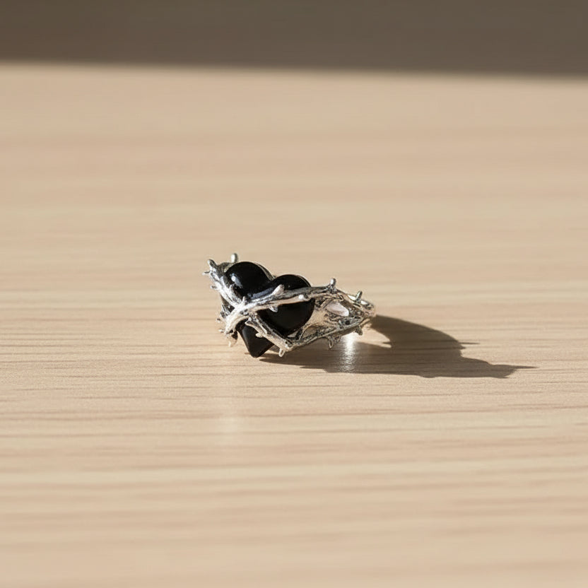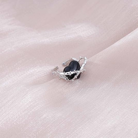 This oversized heart ring captures the essence of steampunk rebellion and romantic mystery. Featuring a glossy black heart embraced by intricately sculpted barbed wire, it creates a dramatic contrast between love and edge. The silver-tone zinc alloy frame enhances the bold structure while remaining lightweight and wearable. Its adjustable open design ensures flexibility and comfort. This piece is made for those who embrace expressive accessories and unapologetic personal style.