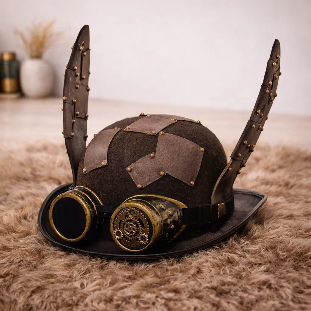 An original steampunk hat with two wings on the sides. A wonderful journey into the original world of steampunk. With leather straps to give an industrial effect and a famous pair of goggles to give the final touch to the hat.
