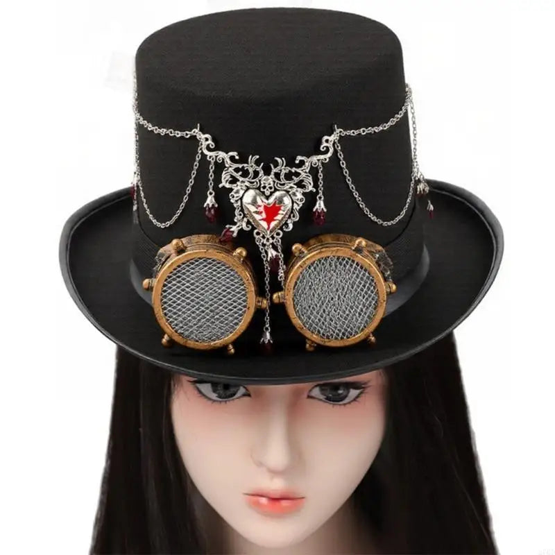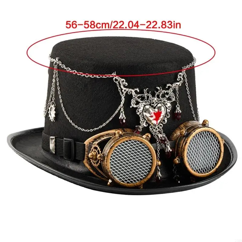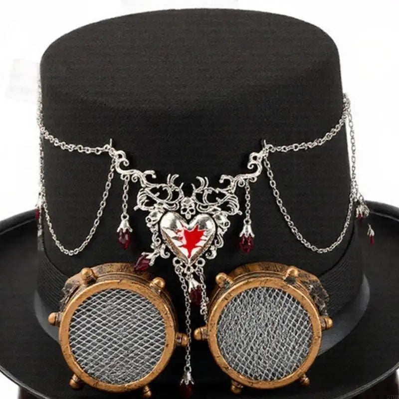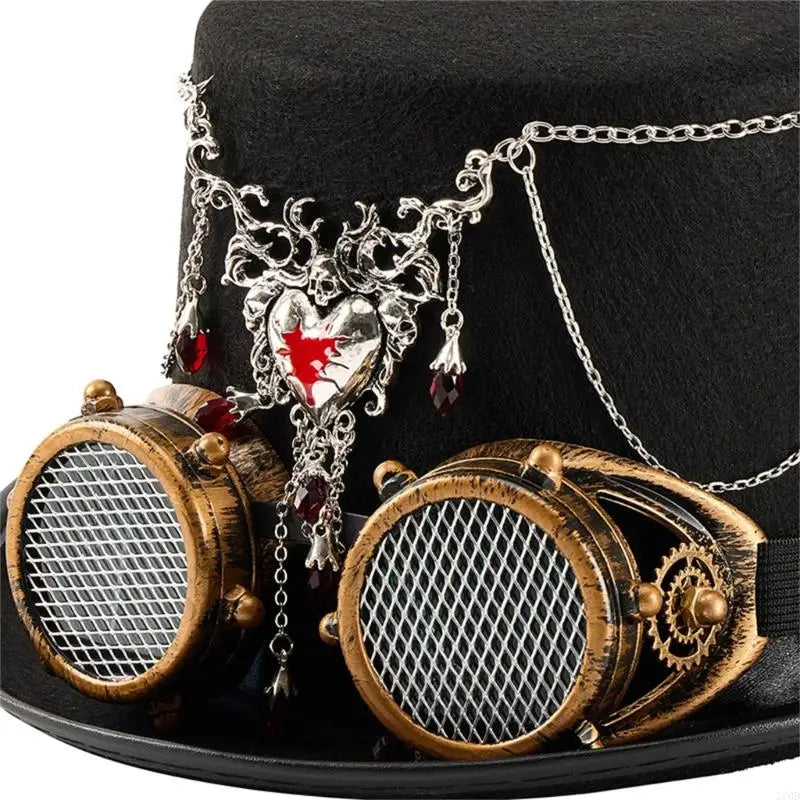 This steampunk top hat is designed for bold personalities who want their outfit to stand out with precision and character. The structured felt base offers a clean silhouette, while the layered metal chains and heart ornament add a gothic edge. The detachable goggles enhance the mechanical aesthetic and allow styling flexibility. Every detail works together to transform a simple costume into a complete and visually striking steampunk look.