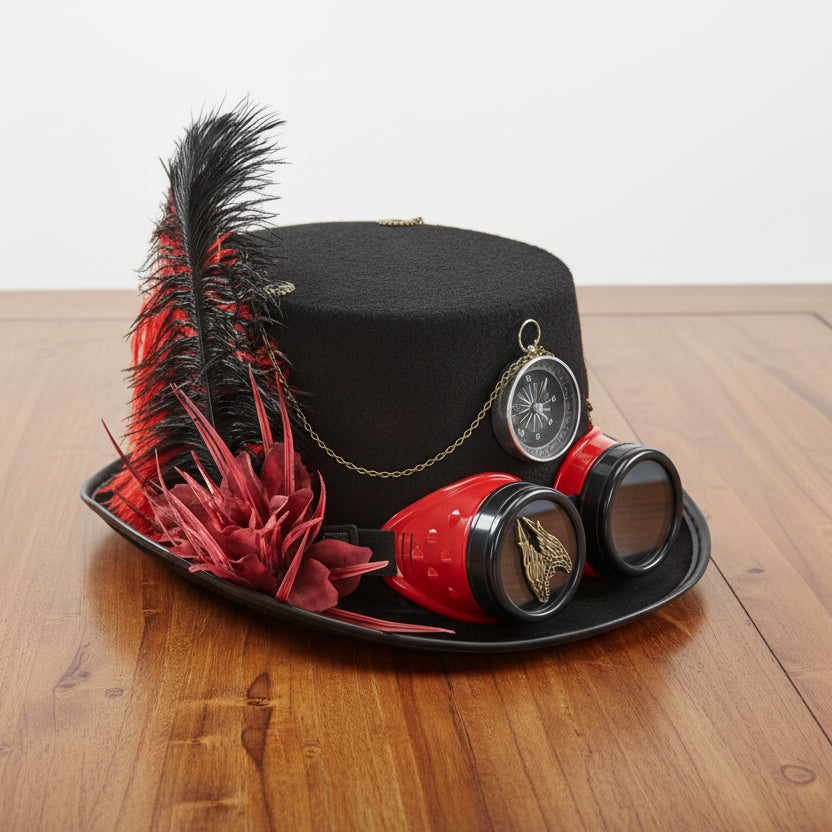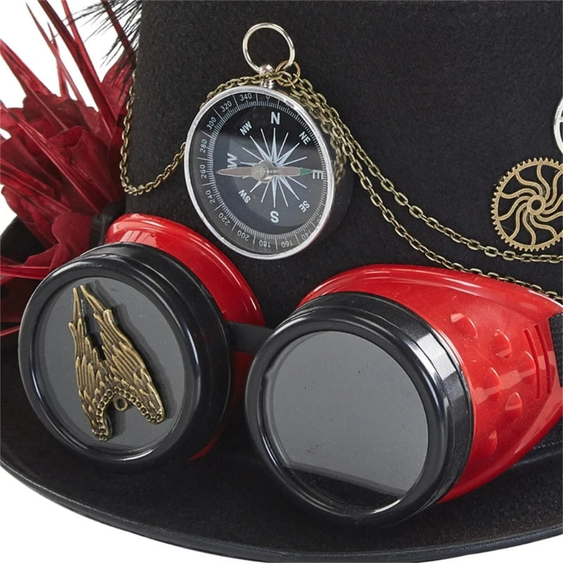 Inspired by retro-futuristic aesthetics, this hat features iconic steampunk elements such as a decorative compass watch, metal gears, and bold goggles. The contrast between the black felt and red accents adds depth and intensity, making it perfect for cosplay, Halloween, or masquerade parties. Comfortable and easy to wear, it adapts effortlessly to different hairstyles while maintaining its striking shape throughout long nights of celebration.