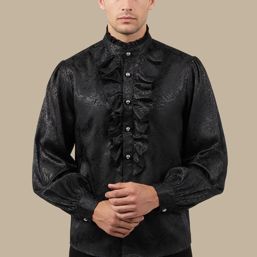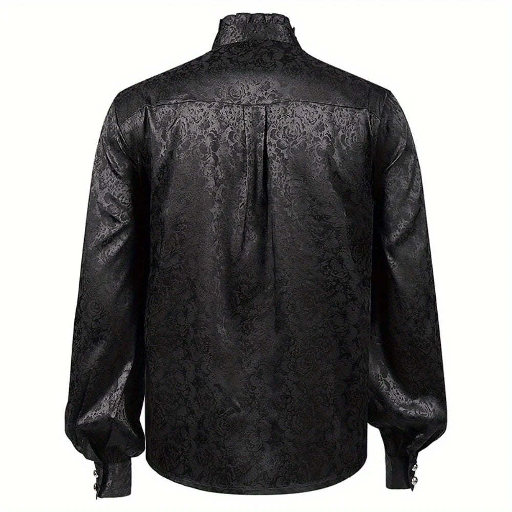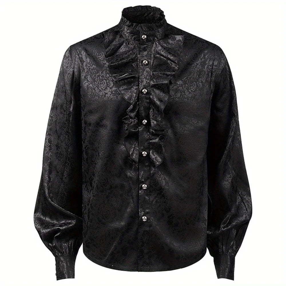 This steampunk jacquard ruffled shirt is designed for men who value refined craftsmanship and dramatic style. The woven floral texture adds depth to the black fabric, while the pleated ruffle front creates a striking layered effect. Inspired by Victorian and medieval silhouettes, this shirt delivers elegance with a dark, sophisticated edge. Ideal for costumes or standout outfits, it brings together historical influence and modern wearability in a bold statement piece.