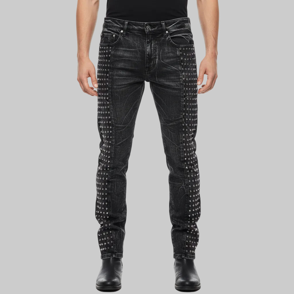 These steampunk jeans with rivets are crafted for men who embrace strong and expressive fashion. The distressed black finish combined with metal stud details delivers a rebellious rock-inspired look. Designed for nightlife, streetwear, and motorcycle style outfits, these jeans elevate your presence effortlessly. Their slim silhouette creates a modern profile while maintaining comfort, making them ideal for everyday wear or standout evening looks.