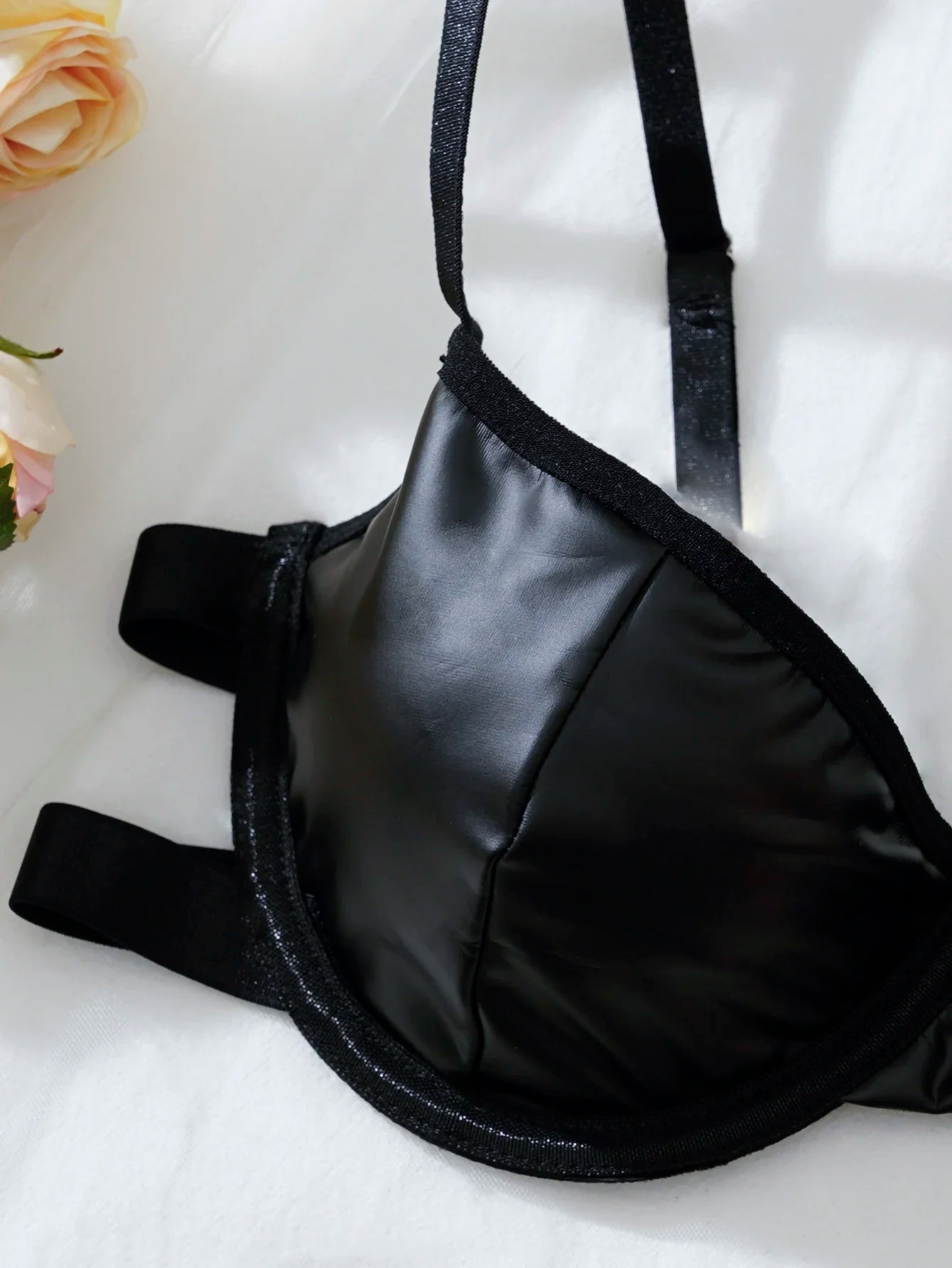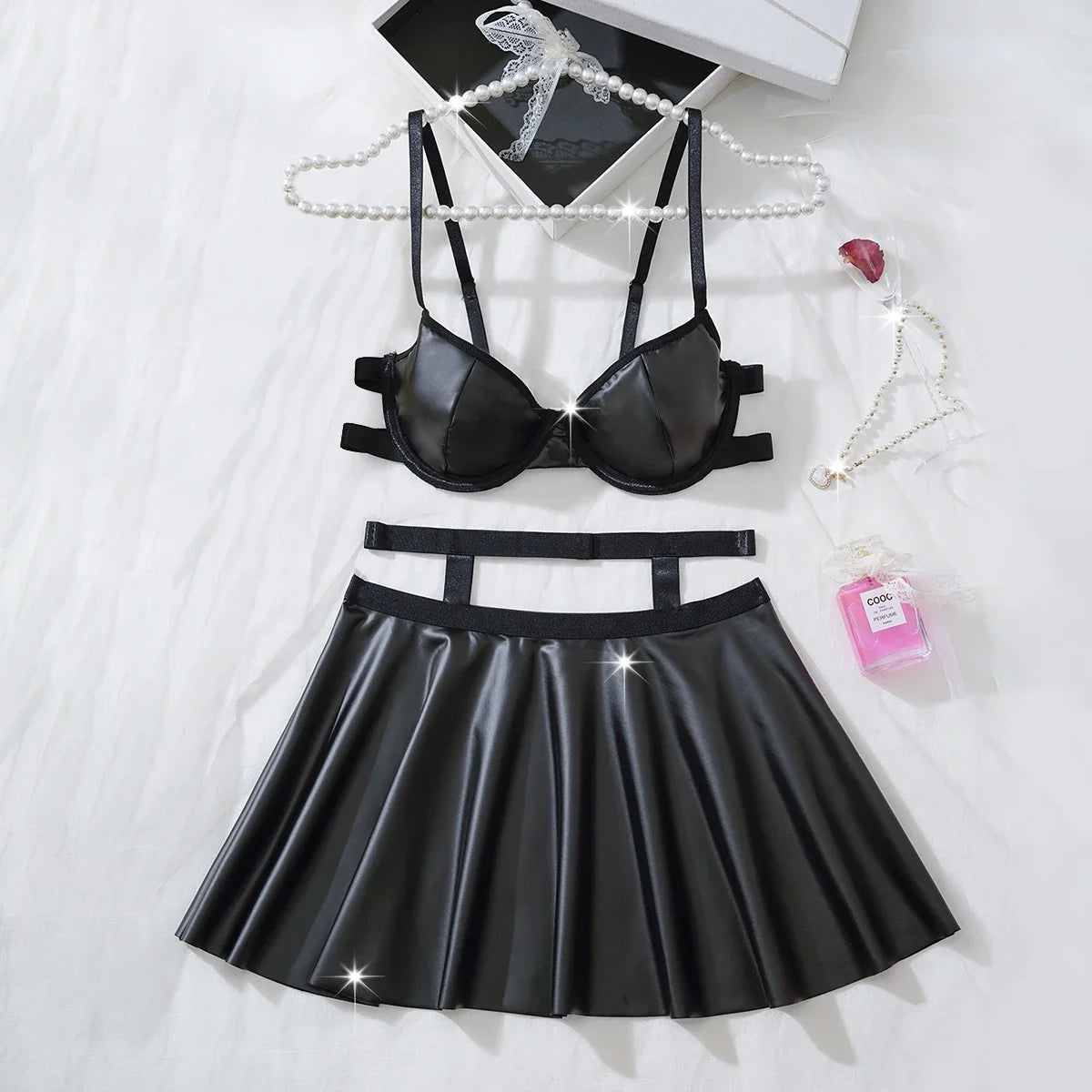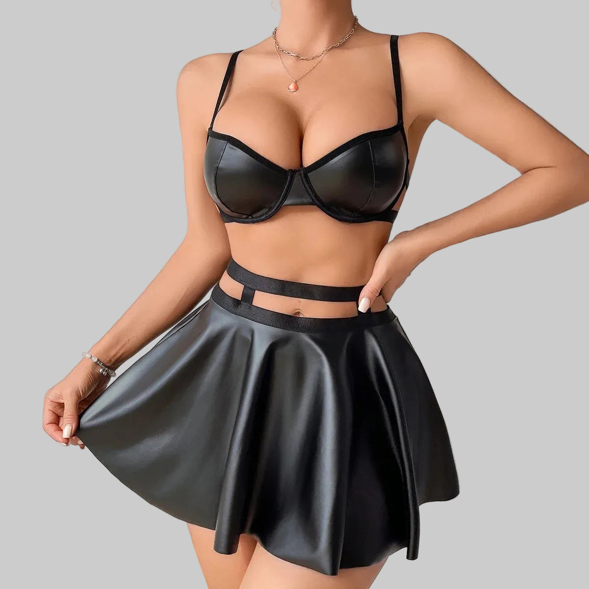 This steampunk-inspired lingerie set blends a structured bra with a flared mini skirt for a powerful and confident silhouette. The leather-look fabric creates a sleek visual impact while remaining flexible and comfortable on the body. Adjustable straps and a secure hook closure ensure a precise fit, while the skirt adds contrast with its soft movement. Designed to stand out, this set is ideal for bold styling, club-inspired outfits, or intimate occasions where confidence takes center stage.