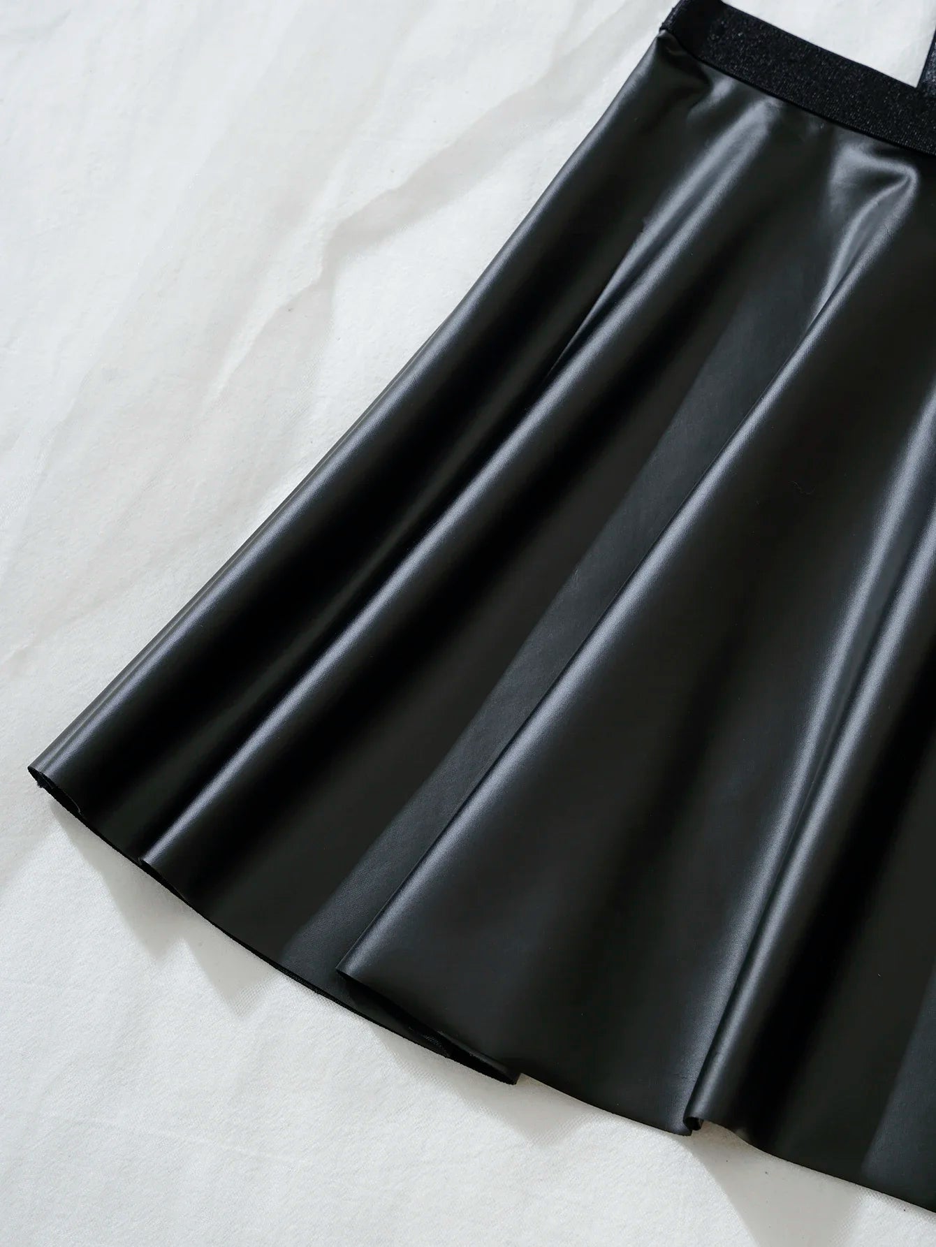 - Sleek leather look paired with a flared skirt for bold confidence.