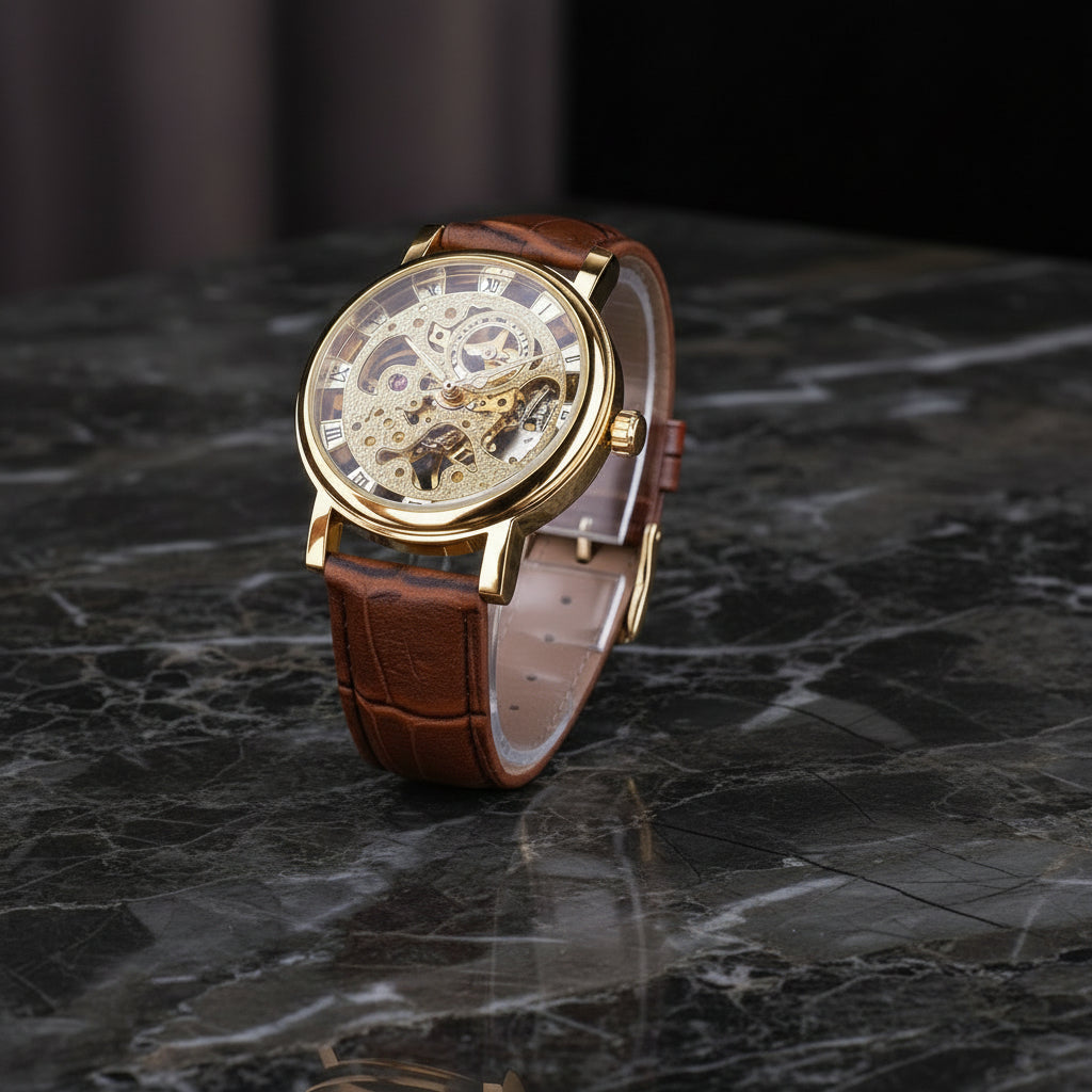 The Steampunk Skeleton Leather Wrist Watch combines the intensity of an openworked dial revealing its gears with the warmth of a genuine leather strap. Its retro-futuristic aesthetic, blending mechanical finesse with a vintage look, creates a powerful and expressive timepiece. Ideal for watch enthusiasts, Steampunk lovers, or bold everyday styles, it instantly draws attention. A perfect watch to express character, precision, and authenticity.