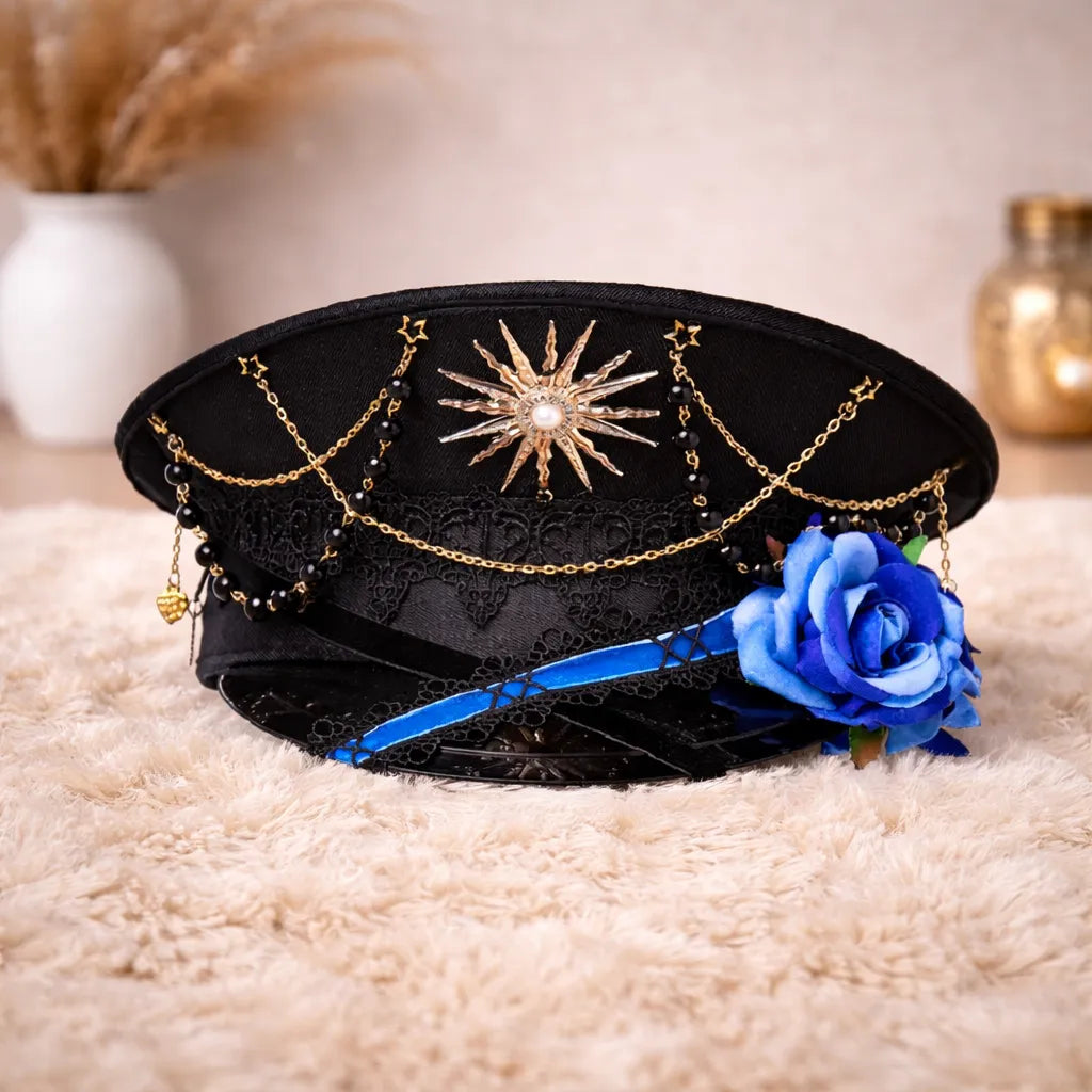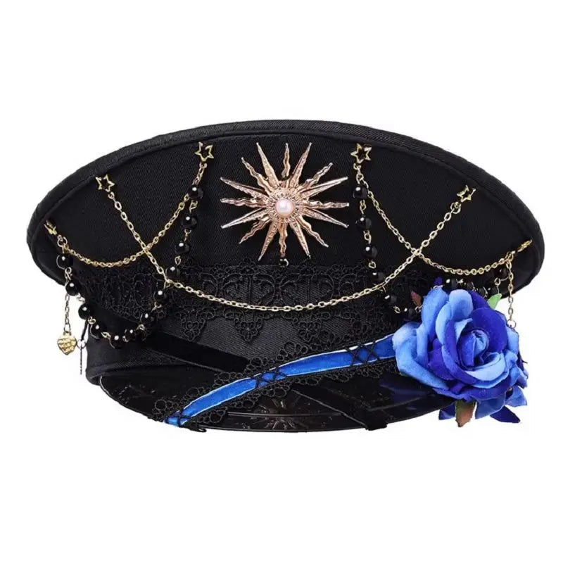 - Design: Steampunk military-style Lolita hat with sun emblem, lace trim, layered chains, and rose decorations