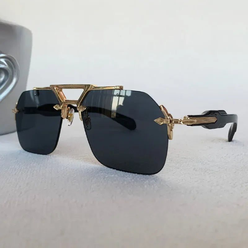 - Adopt an elegant and avant-garde look with these rimless steampunk sunglasses, offering a modern flair while ensuring optimal sun protection.