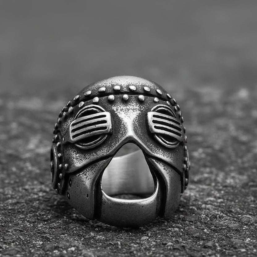 This Steampunk Robot Ring captures the raw energy of cybernetic design with its bold mechanical mask shape and textured metallic surface. Made from durable 316L stainless steel, it offers exceptional resistance to fading, rust, and skin irritation. The striking 29 x 27 mm face creates a commanding presence, while the polished silver finish with dark accents enhances its futuristic depth. It is more than jewelry—it is wearable industrial art.