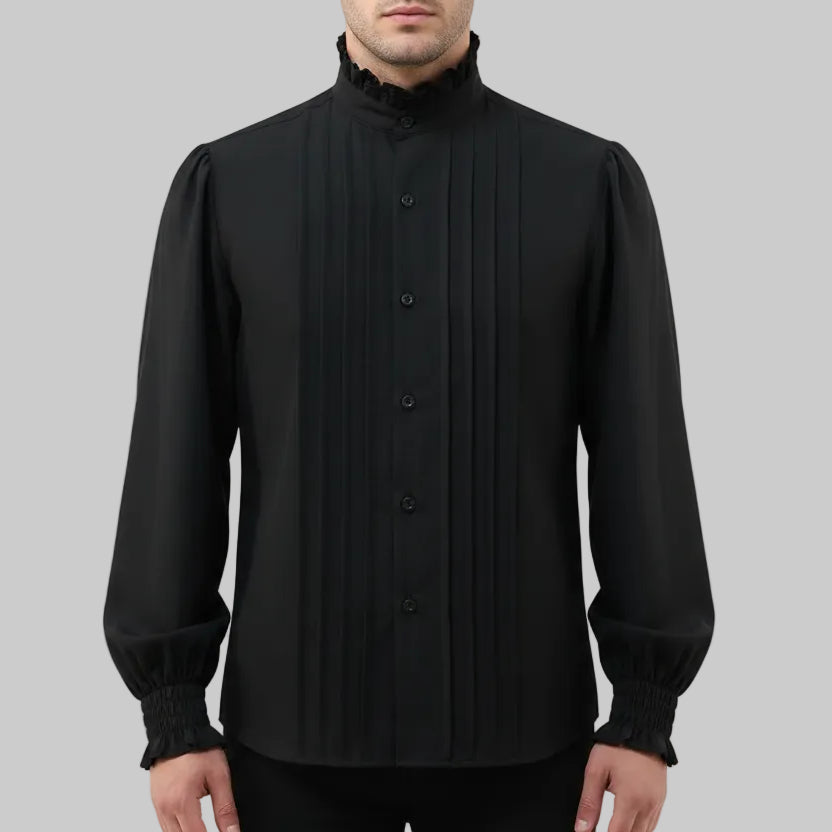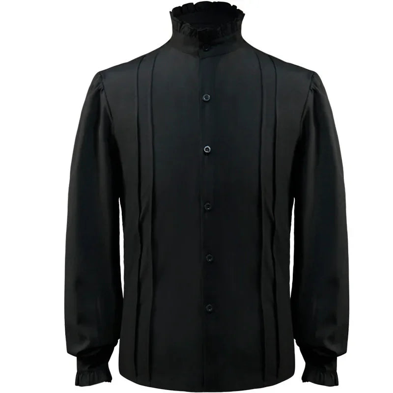 This steampunk shirt draws from medieval and Victorian tailoring to create a bold, commanding presence. The stand-up collar frames the neckline with authority, while vertical pleats add structure and refinement. Designed for men who appreciate historical fashion with a modern edge, it offers a clean yet dramatic aesthetic. Perfect for cosplay or expressive styling, this shirt embodies confidence, tradition, and distinctive steampunk identity.