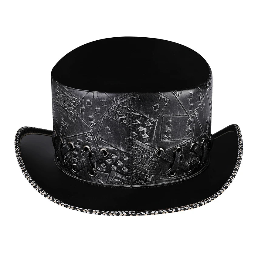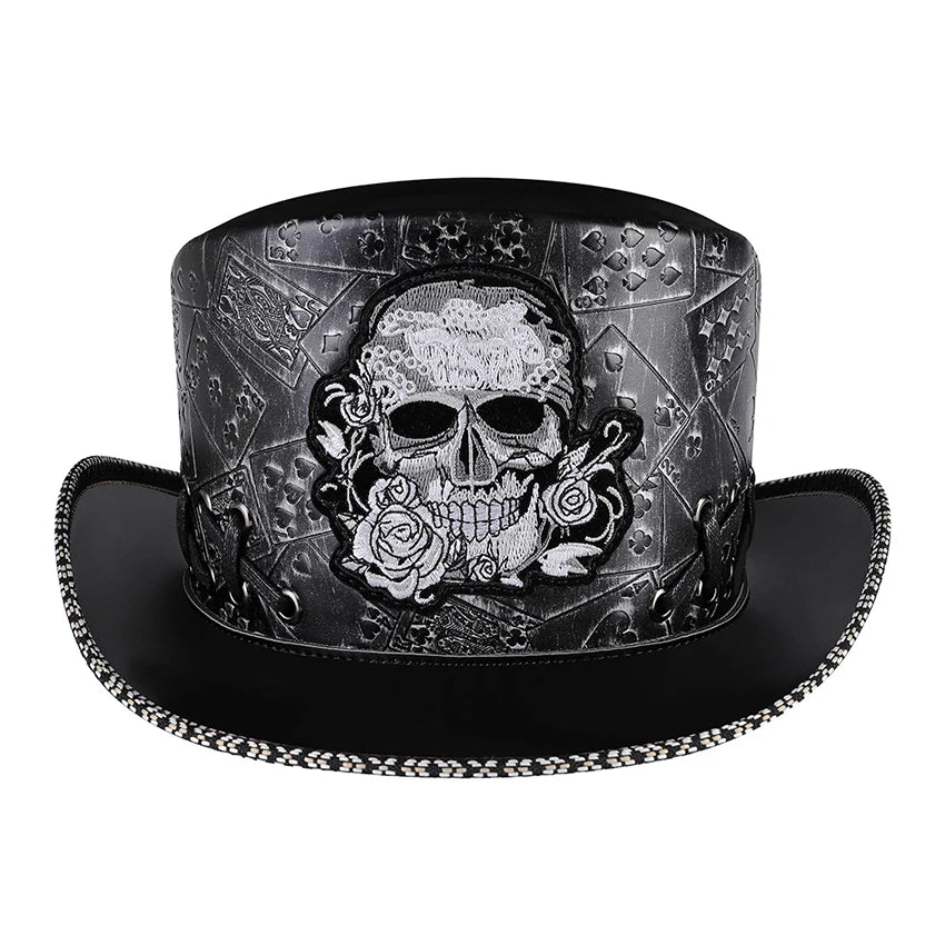 - Assert your authority with this exclusive steampunk top hat, where the dark elegance of an embroidered skull meets the mystery of an engraved deck of cards for a truly unforgettable style !