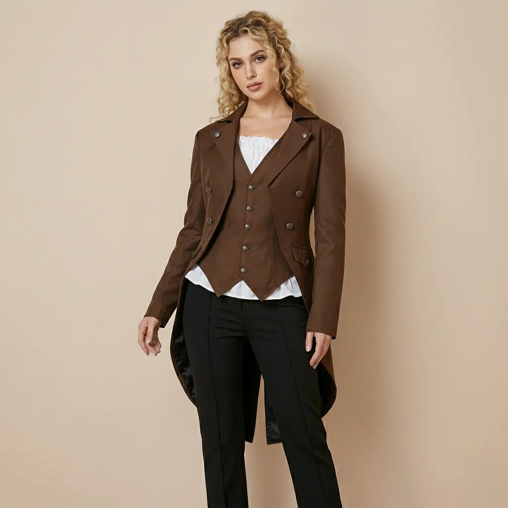 The Steampunk Society Jacket combines Victorian sophistication with retro-futuristic innovation to create a charismatic and memorable silhouette. Its delicate embroidery, refined metal buttons, and structured cut evoke the elegance of a secret society of inventors. Ideal for conventions, artistic performances, or alternative looks, it instantly attracts attention. A jacket designed to reveal confidence, creativity, and distinction, while offering a powerful and unique visual presence.