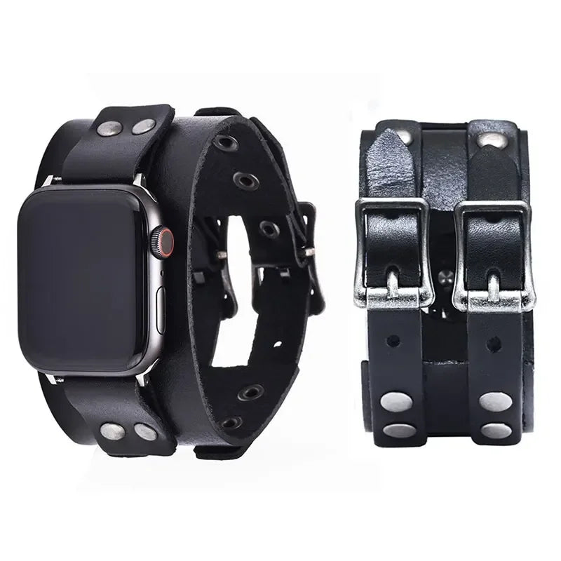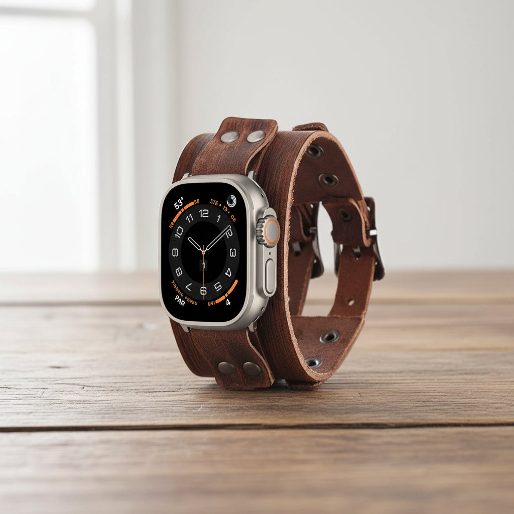 This strap features a wide leather cuff that wraps around the wrist with a strong and confident presence. The combination of rivets, metal connectors and double buckle straps creates a distinctive steampunk aesthetic. Its textured leather finish adds depth and character, while the open center design highlights the watch face. This accessory transforms a standard smartwatch into a bold statement piece designed for individuals who want a unique and expressive style.