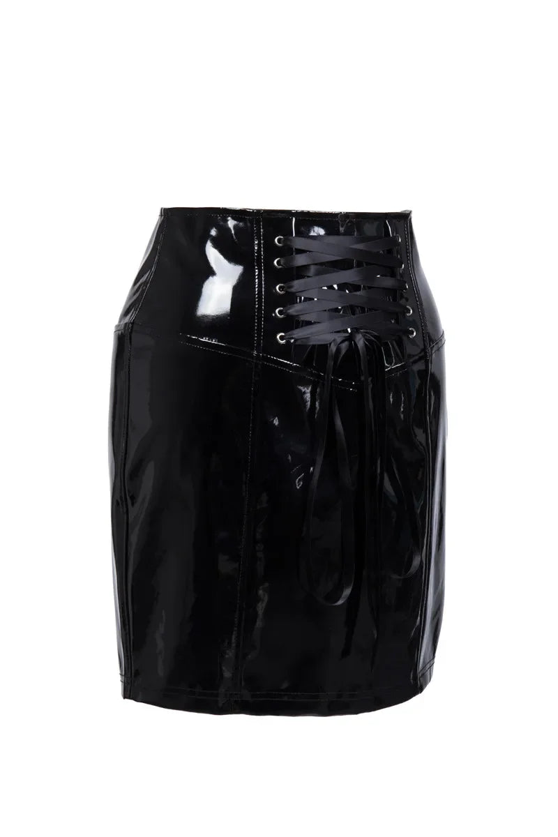 - The shiny PVC finish and lace-up front add an edgy touch, while the high-waisted pencil silhouette accentuates your curves for a flawless look.