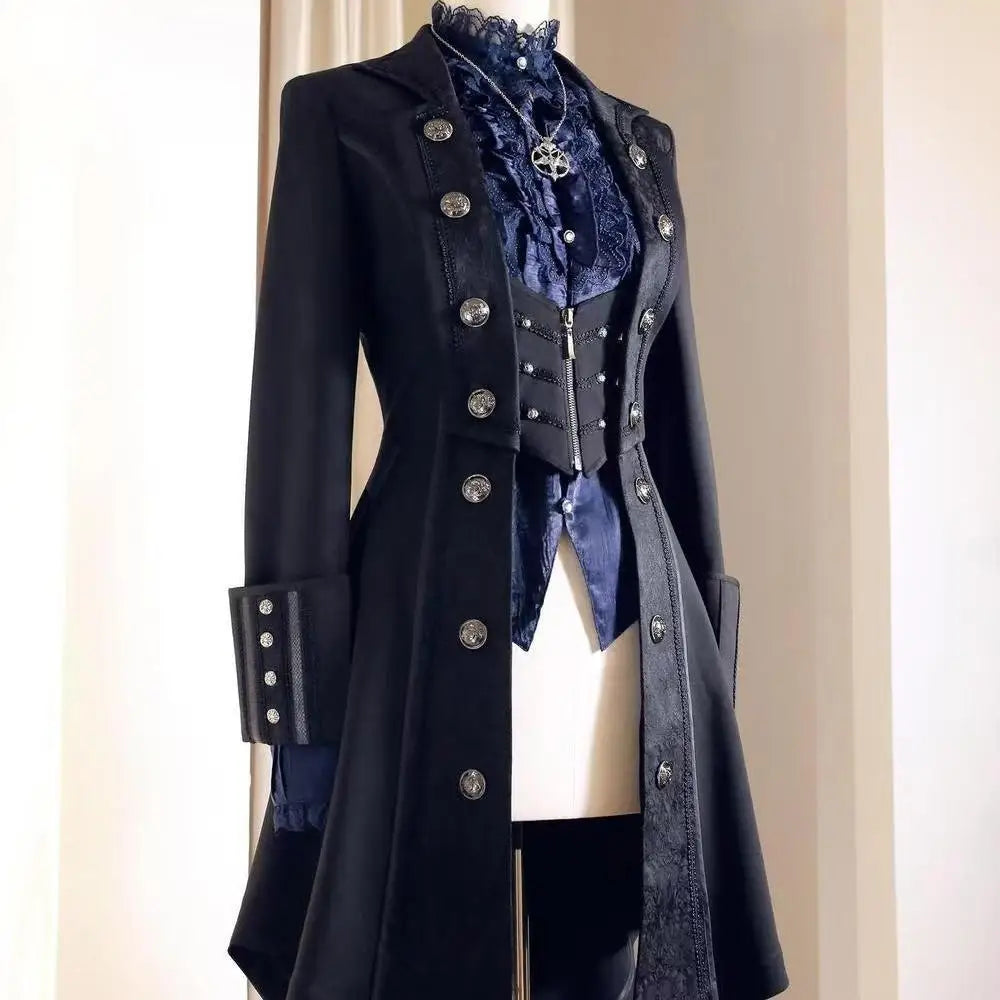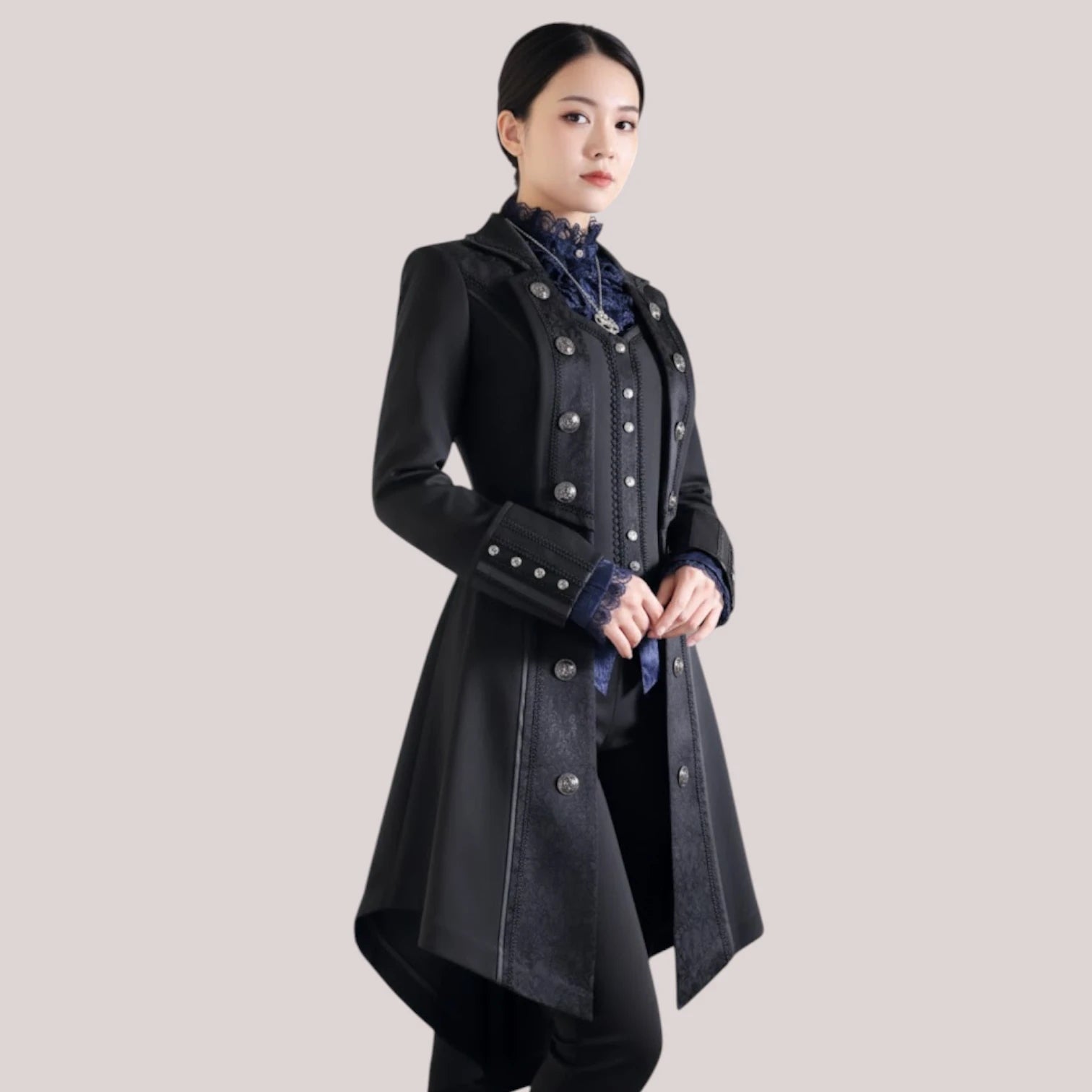 - Design: A long trench-style coat with intricate button detailing, lace accents, and a structured silhouette.