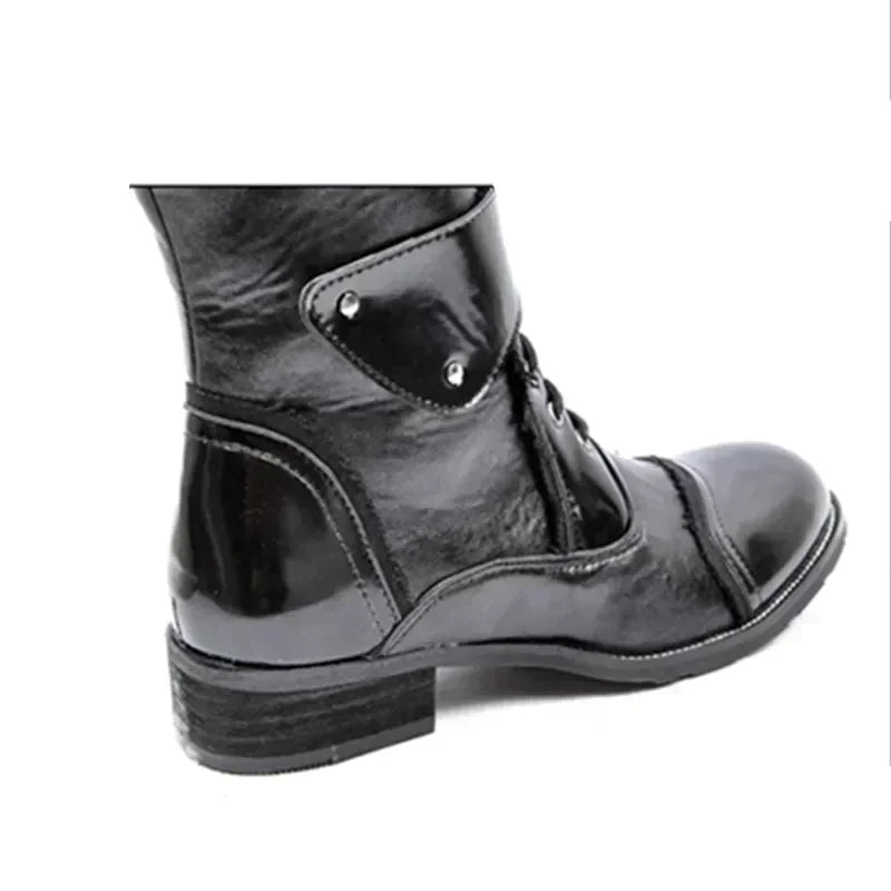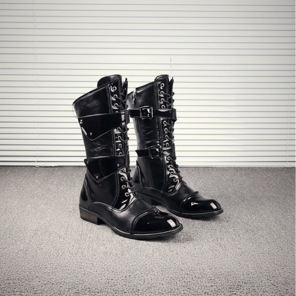 These stylish gothic steampunk leather boots are designed to make an instant visual impact. The high-shine patent leather reflects light beautifully, while the layered straps and metal buckles add depth and attitude. The mid-calf height enhances the silhouette, giving structure and dominance to any outfit. Whether paired with gothic fashion, alternative streetwear or statement costumes, these boots bring a confident edge that transforms your look with minimal effort.