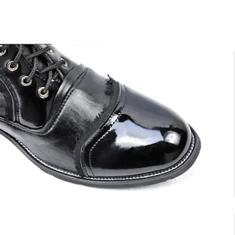 - The glossy patent finish combined with metal straps creates a powerful silhouette that stands out in alternative, gothic or streetwear looks.