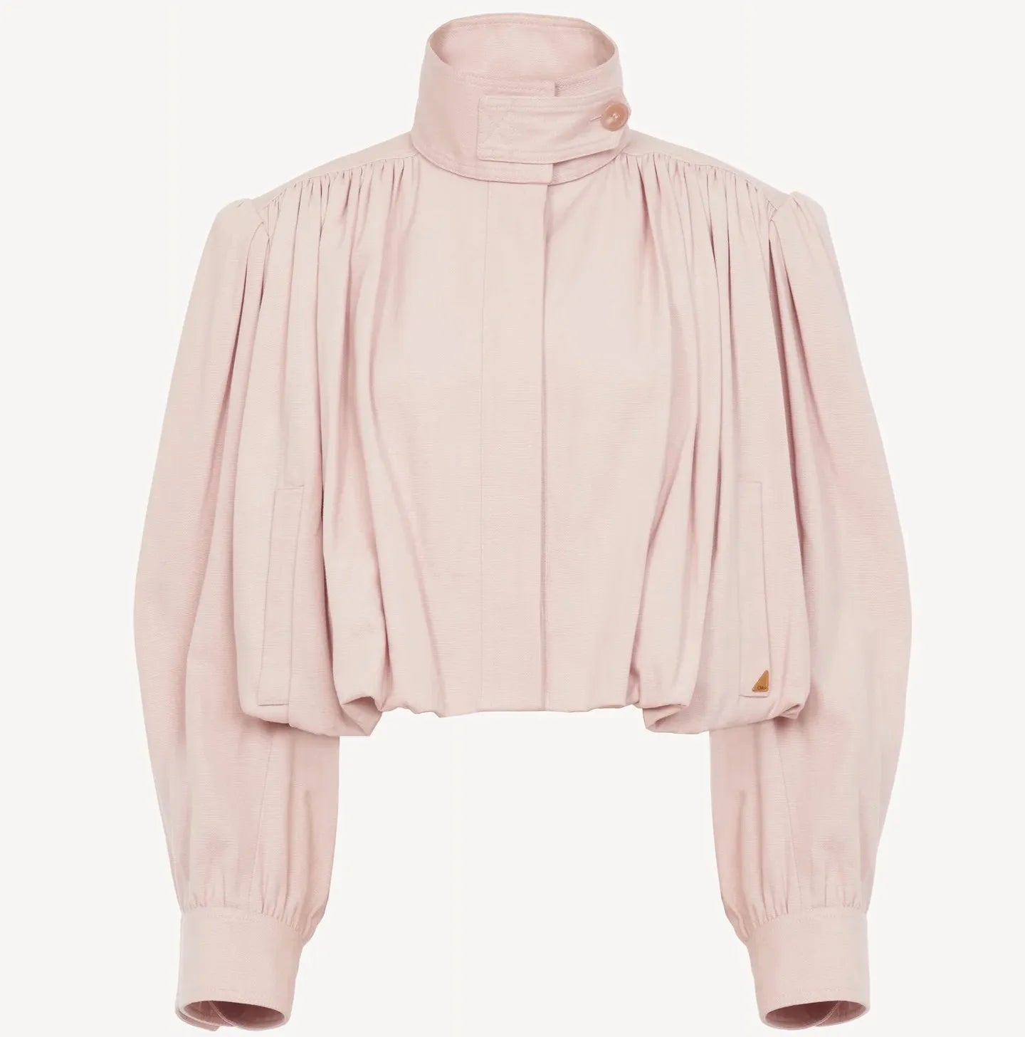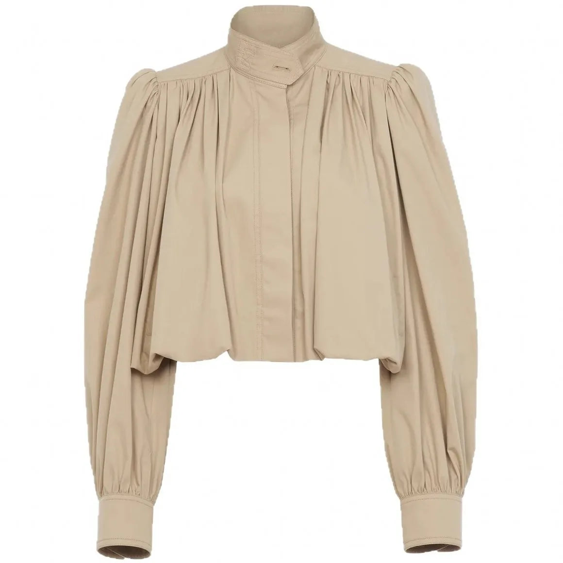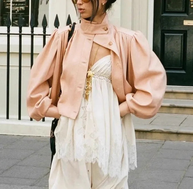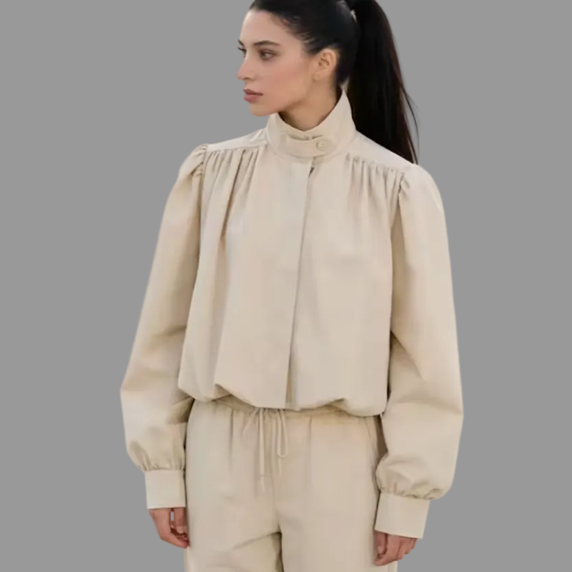 This bomber jacket stands out with its architectural volume and cropped silhouette. The gathered sleeves and structured body create a refined yet bold shape that enhances the upper body beautifully. Inspired by steampunk aesthetics and modern varsity fashion, it brings a unique character to everyday outfits. The neutral beige tone adds elegance and versatility, making it easy to pair with denim, trousers, or skirts for a polished and contemporary look.