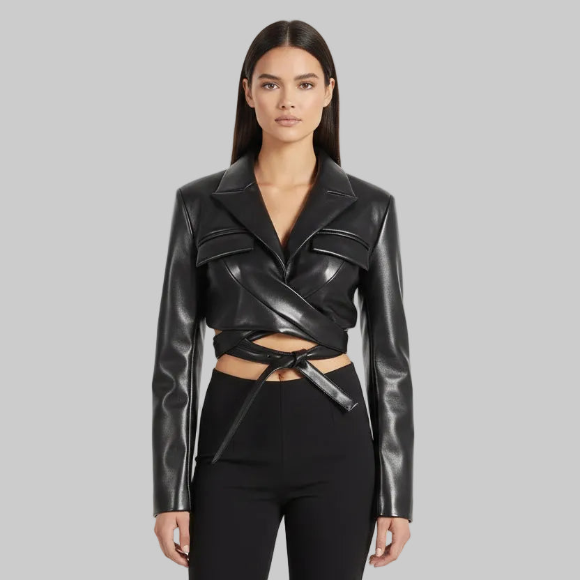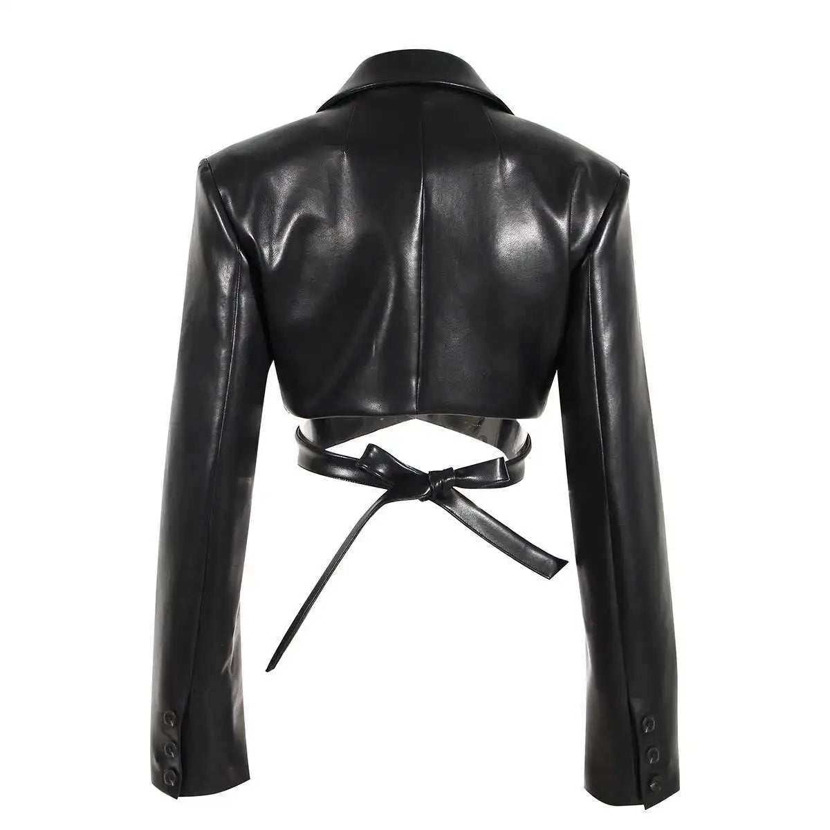 - The spliced bandage design and lace-up detail create a unique, fashion-forward look, making this jacket a statement piece in any wardrobe.