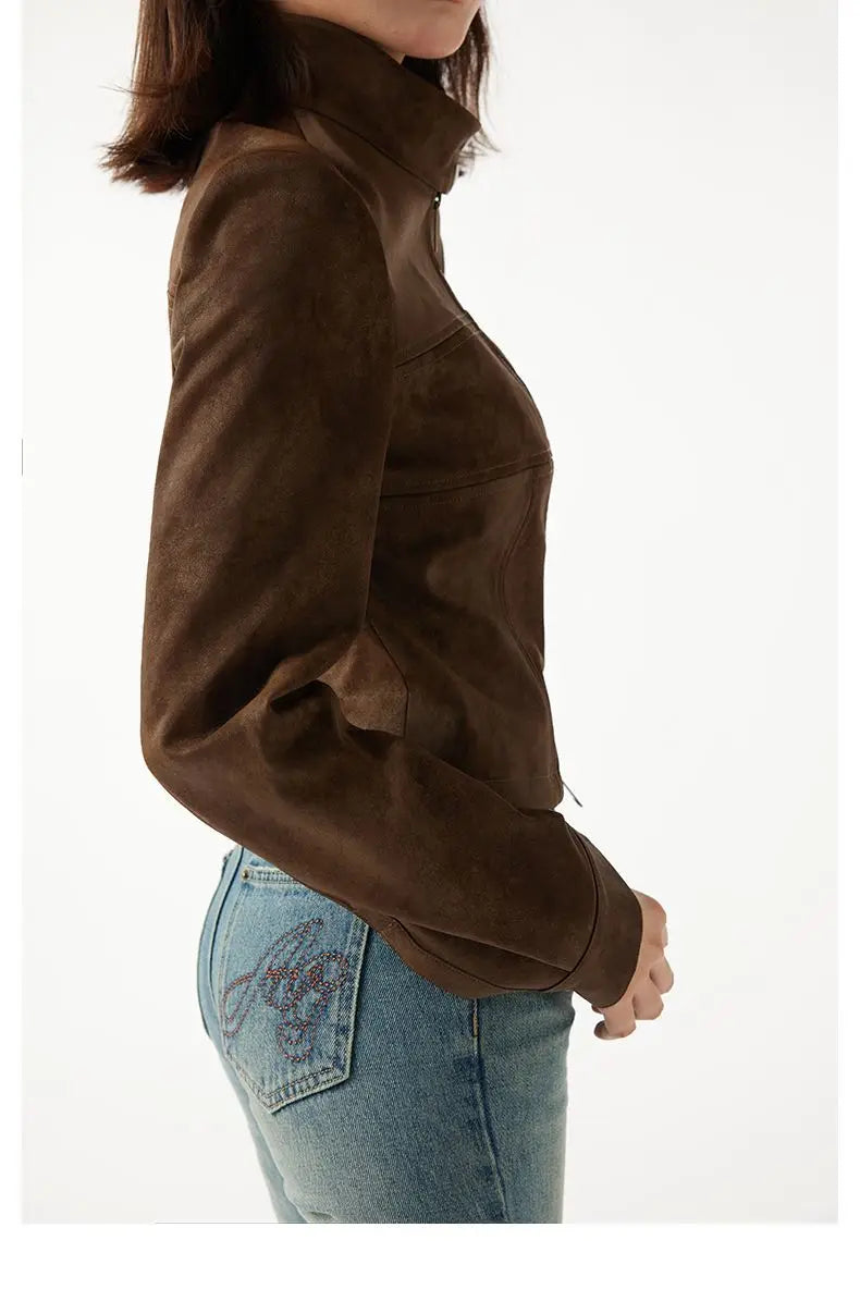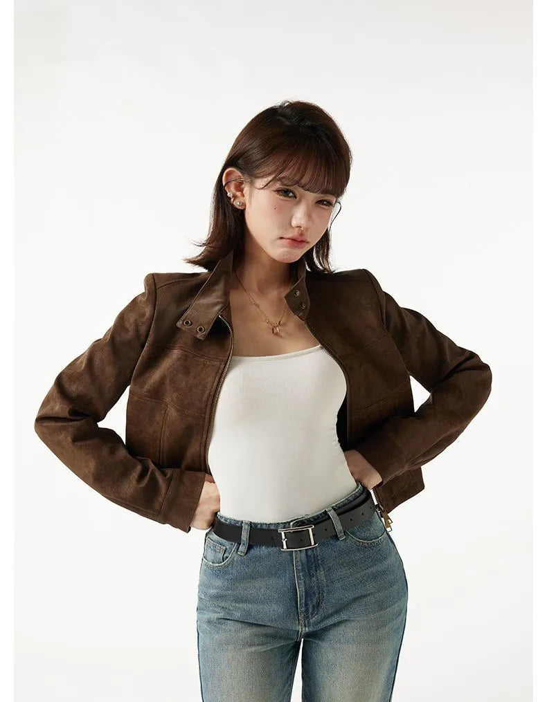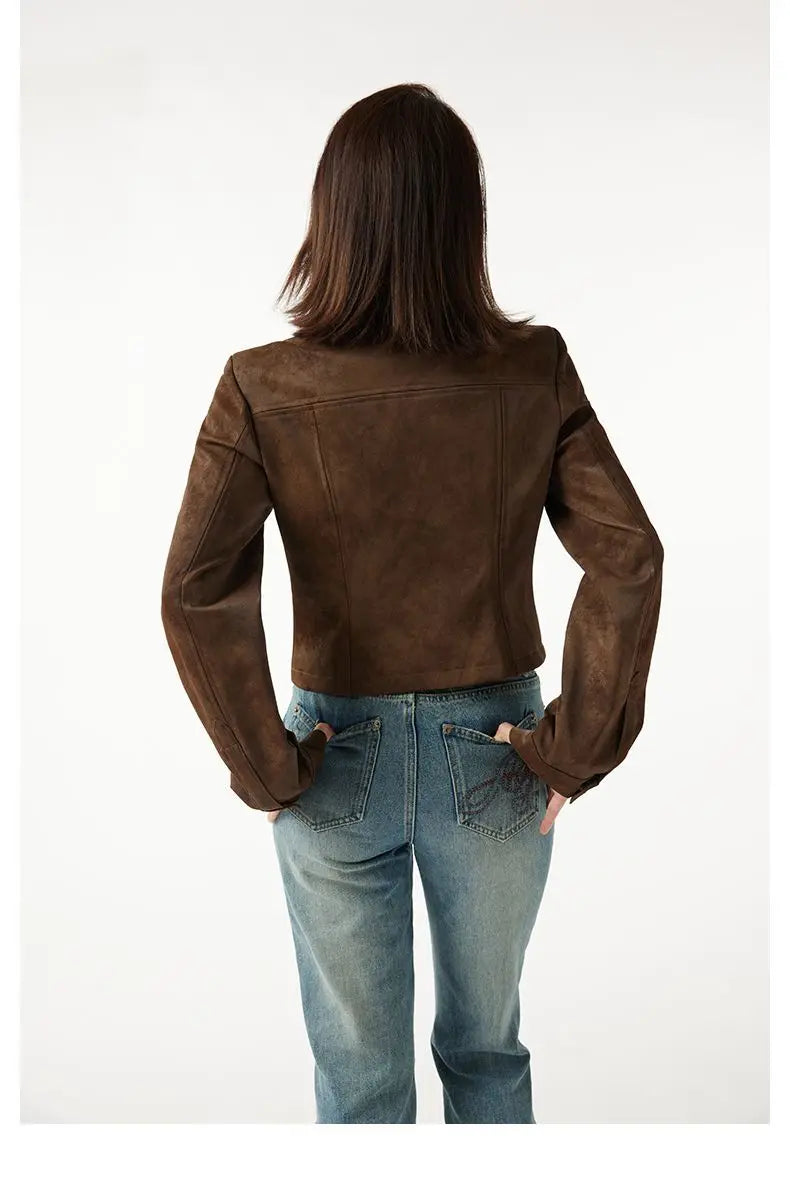 This women’s brown aviator steampunk bomber jacket combines structured design with modern femininity. The cropped silhouette enhances proportions while the warm brown color adds a refined vintage feel. Crafted from a cotton and polyester blend, it offers comfort without losing shape. Zipper details and a stand collar create a confident look, making this jacket ideal for everyday wear, office-inspired outfits, or statement street style.