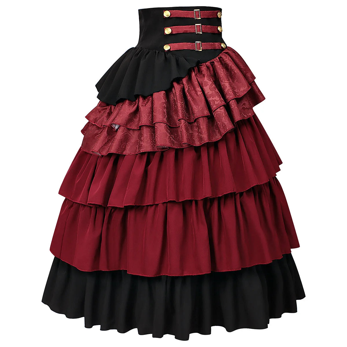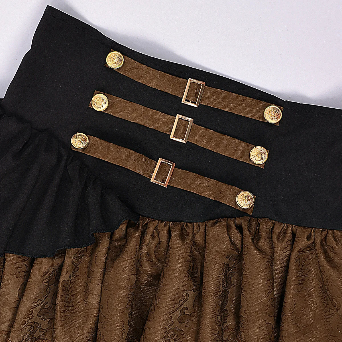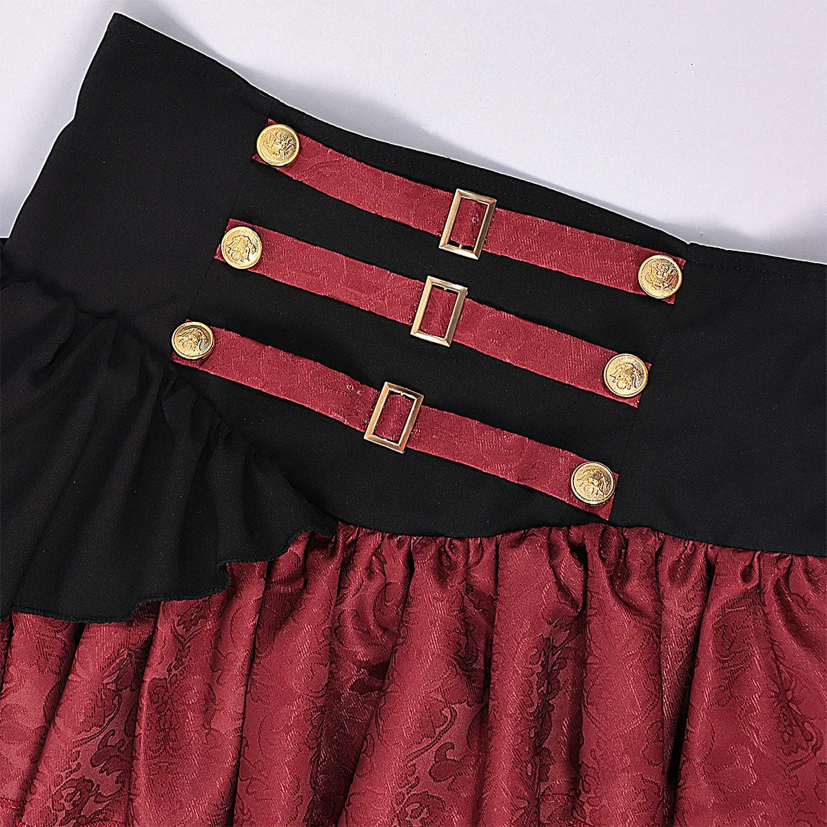 Inspired by Victorian and medieval pirate aesthetics, this steampunk skirt is designed for women who want a dramatic and confident look. The structured corset waist enhances the silhouette while the layered ruffles add volume and movement. Its rich color contrast and detailed finishes create a strong visual identity, making this skirt a standout piece for alternative wardrobes, cosplay outfits, or themed events where character and style matter.