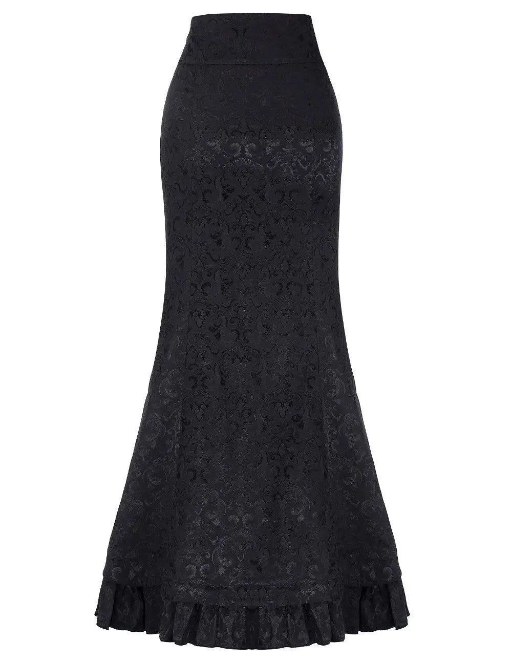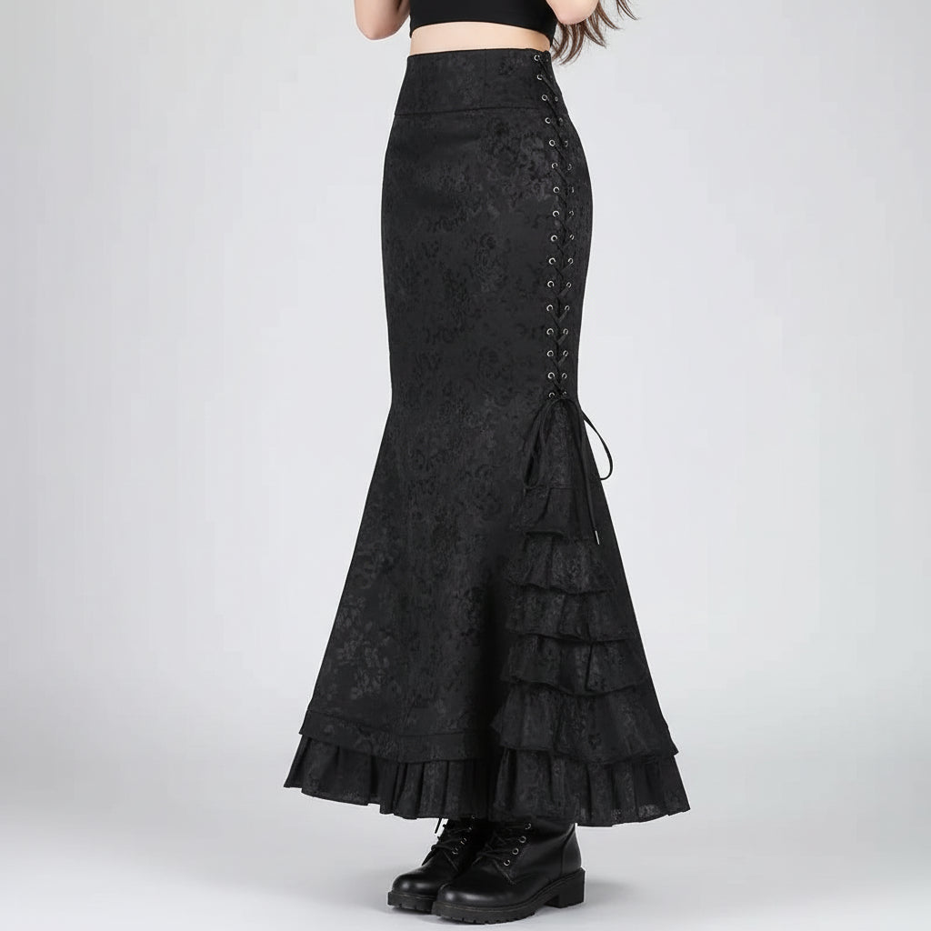 This Victorian steampunk maxi skirt is crafted to highlight the waist and hips with a refined high-waist design. The fitted silhouette flows into a flared fishtail hem, creating elegant movement with every step. Lace-up detailing with eyelet holes adds a bold corset-inspired accent, while the textured fabric brings depth and richness to the look. Designed for women who appreciate vintage fashion with attitude, this skirt delivers both structure and drama.