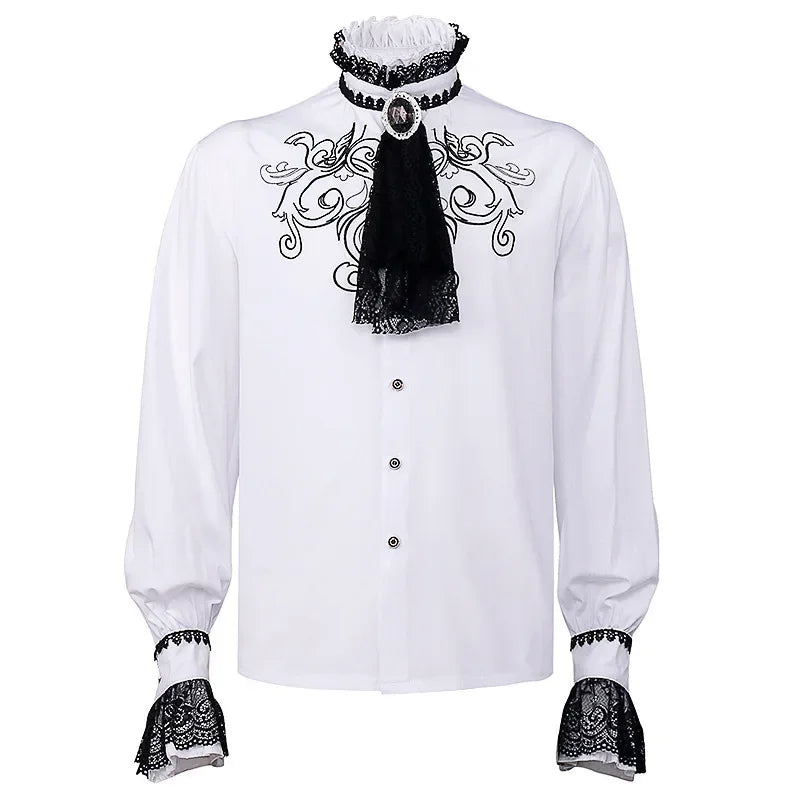 This white steampunk shirt embodies Victorian gothic refinement through its intricate embroidery and structured silhouette. The ornamental chest design and lace cravat evoke aristocratic fashion, while the stand collar enhances its noble appearance. Created for men who seek expressive costume pieces, it balances dramatic styling with wearable comfort. Perfect for Renaissance events or gothic performances, this shirt transforms historical inspiration into a bold and elegant statement.