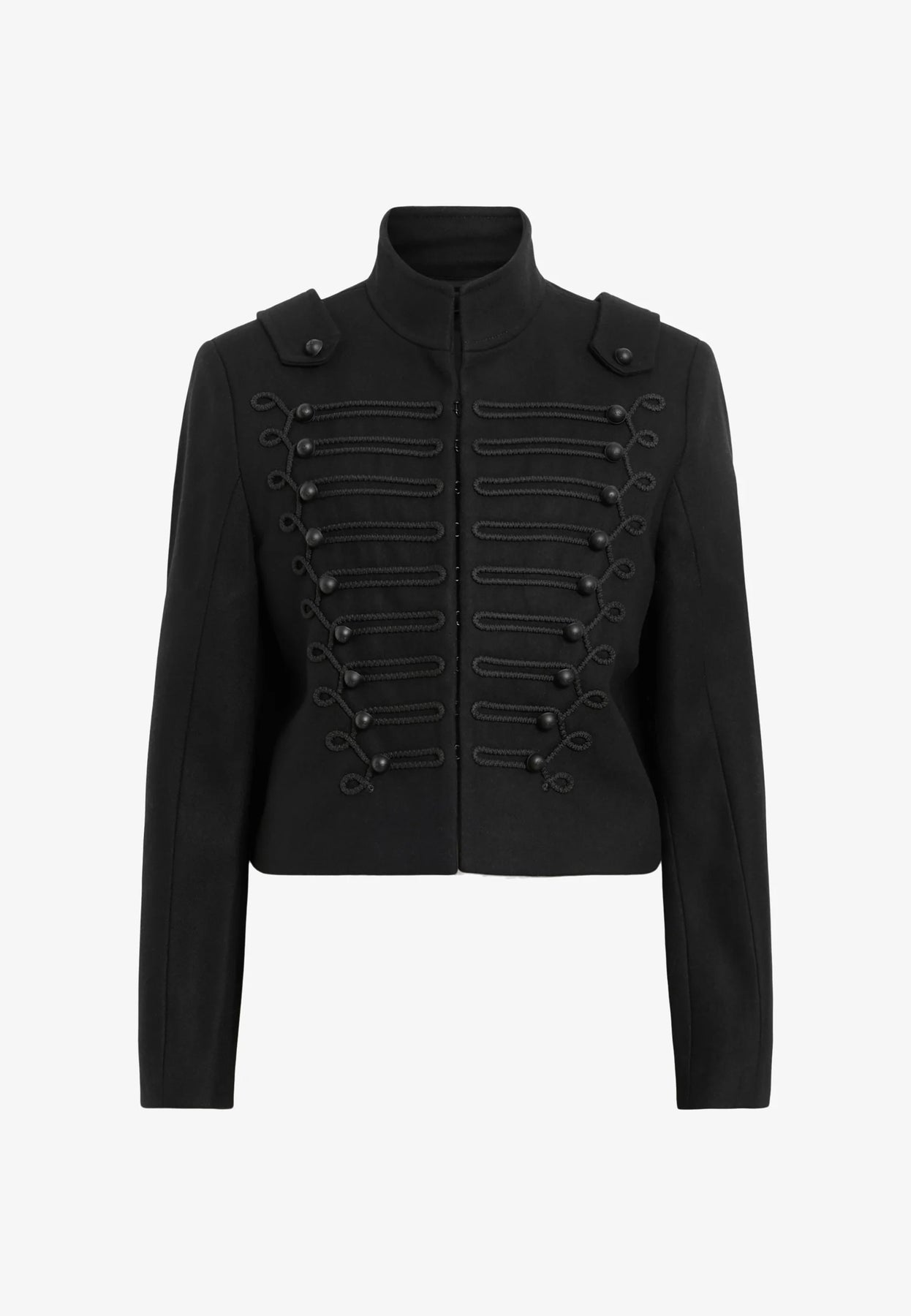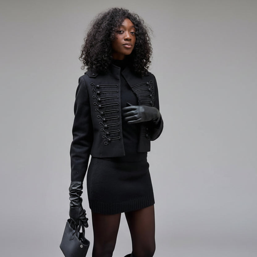 - Design: Napoleon-style cropped jacket with a braided button trim for a vintage, military-inspired look.