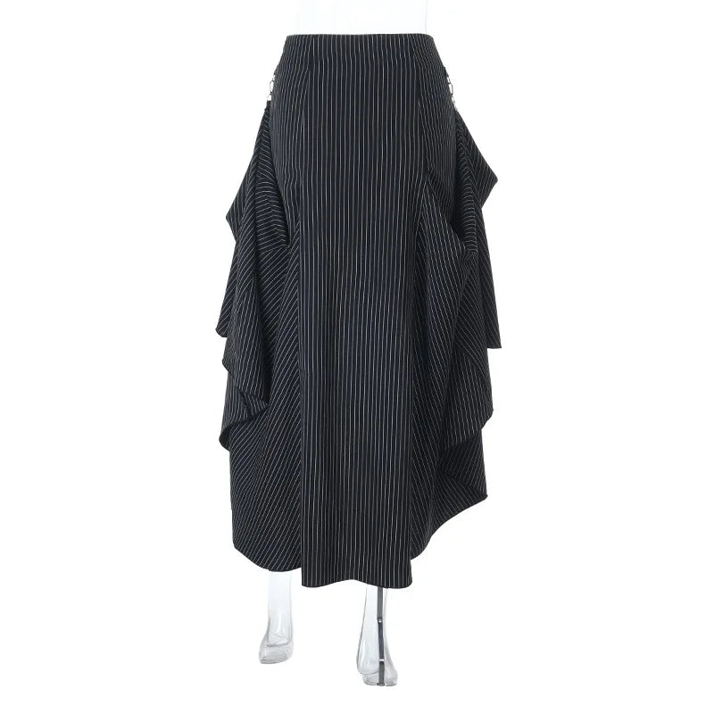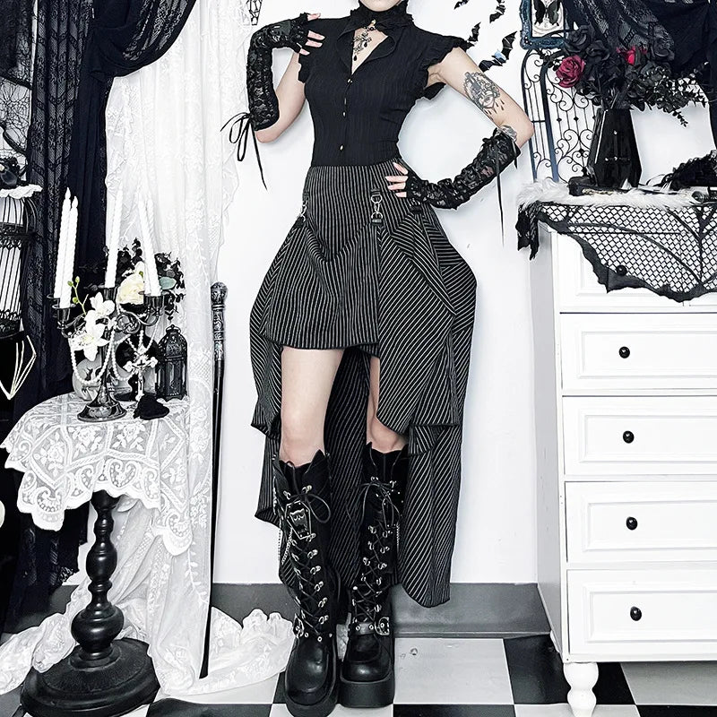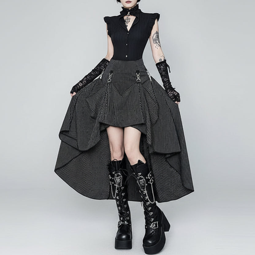 Embrace the goth grunge aesthetic with this high-waisted striped skirt. Designed for the modern fashion lover, this skirt combines vintage, making it perfect for creating a streetwear-inspired outfit. The bold stripes and flattering high-waisted cut provide a sharp, edgy silhouette that pairs effortlessly with a variety of tops. Whether you’re dressing up for a goth event or just want to add a unique touch to your everyday wardrobe, this skirt is the perfect choice.